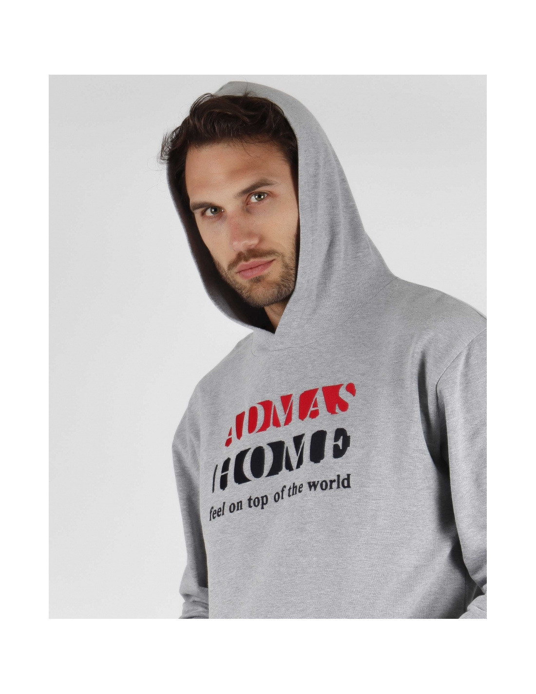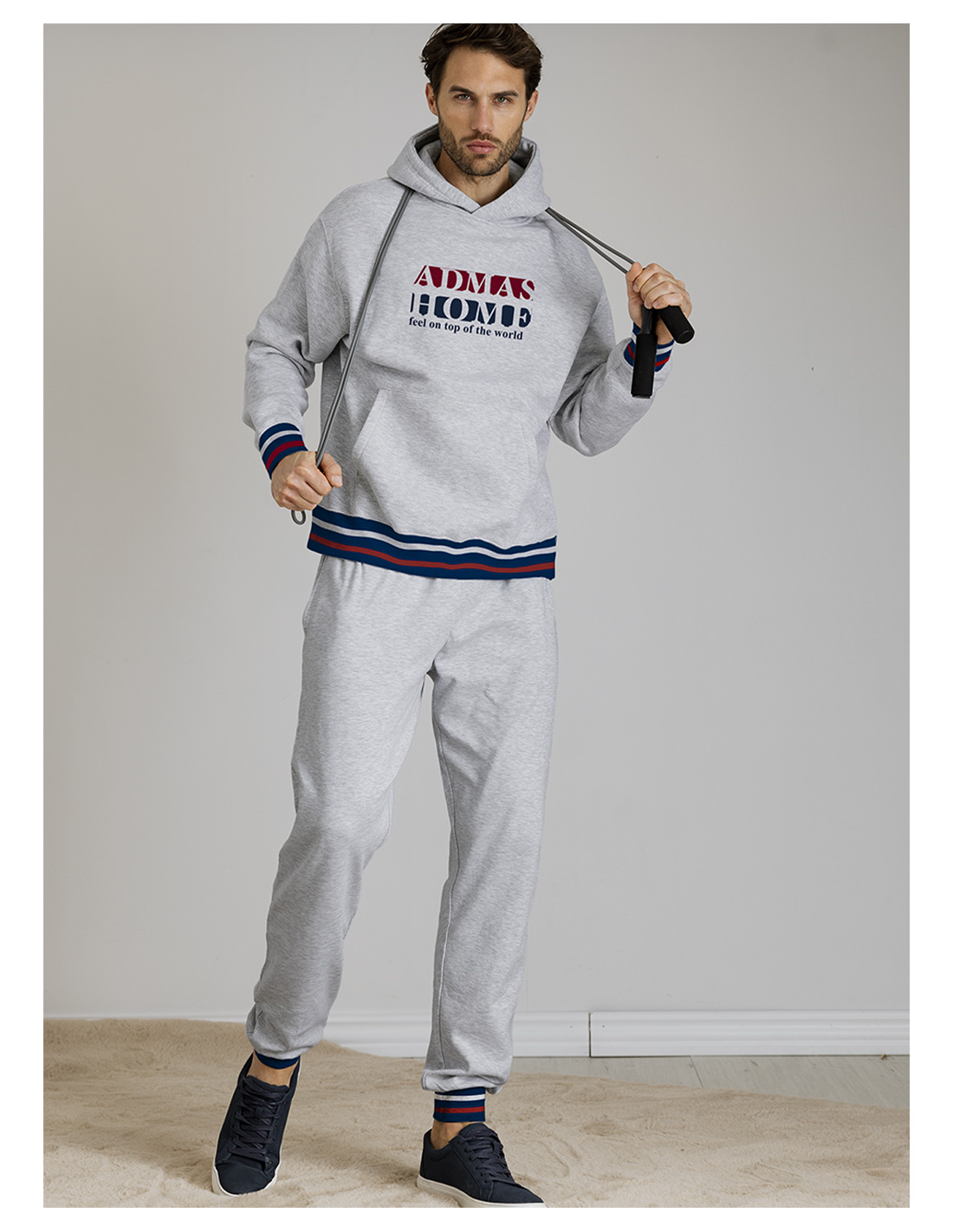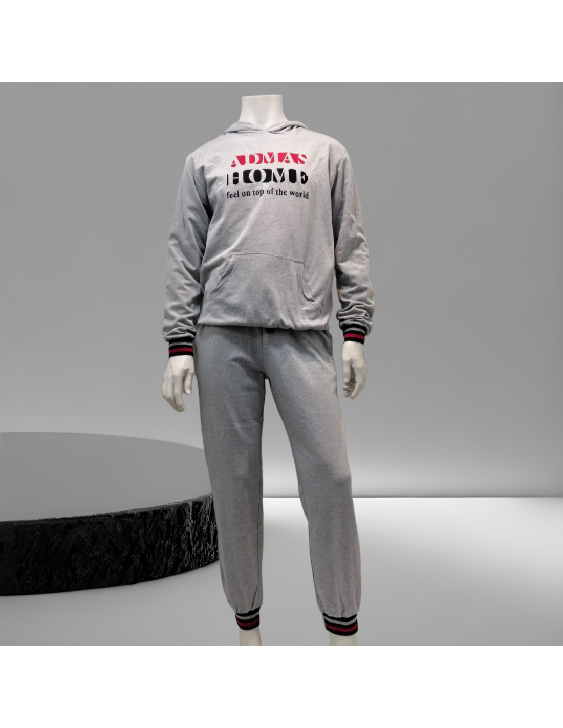 Pajamas in plush fabric (cotton tracksuit type fabric), long sleeves, round neck and long pants with hood.