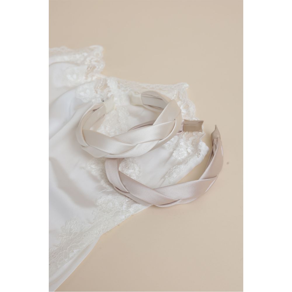 * Braided satin bridal headband, available in two colors: ecru and pink.