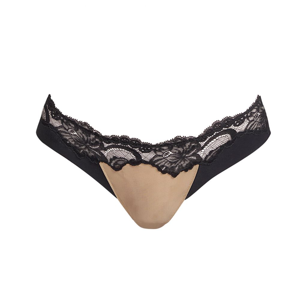 Classic Brazilian brief. Simplicity in the rear structure, without elastic bands. At the front, a perfect marriage combining tulle, a strip of Leavers lace and a cleancut fabric gives birth to a comfortable Brazilian brief, revisited in a more fashionable look. Black, black color combined with nude color tulle. Strong, surprising and perfect for a FW collection.
