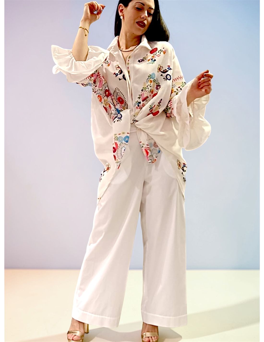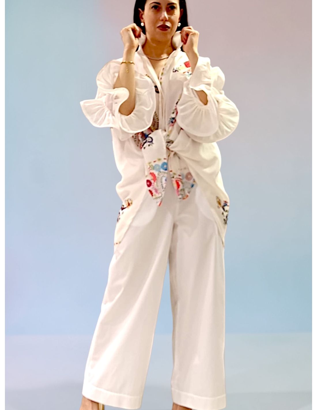 Inspired by a vibrant and sun-drenched Latino spirit, the new Au Soleil de Saint-Tropez collection embodies effortless beach elegance. These oversized shirts feature dramatically flared sleeves and feminine ruffle details for a flowing, relaxed silhouette. Slightly shorter at the front and longer at the back, they can be worn fully buttoned or open over a swimsuit for a chic summer look. Available in both printed and solid versions, they evoke a cool, Mexican-inspired aesthetic with natural sophistication. Crafted from polyamide and cotton, they are lightweight, wrinkle-resistant and perfect for packing in your holiday suitcase. An easy-to-wear piece that transitions seamlessly from the beach to sunset drinks.