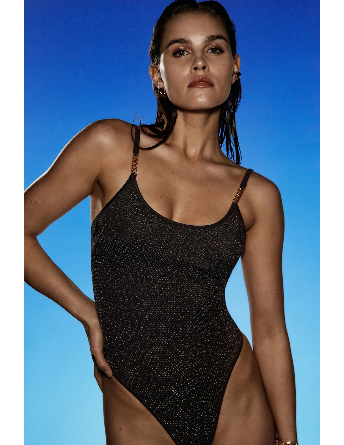 Designed to turn heads—in the sun or under the spotlights. Available in 3 bold top and bottom styles to suit every mood, shape, and moment. Made from Italian lurex mesh, some embellished with a gold chain for a touch of sophistication. Versatility at its finest: wear the triangle top as a top or tankini; the dress? The choice is yours.
