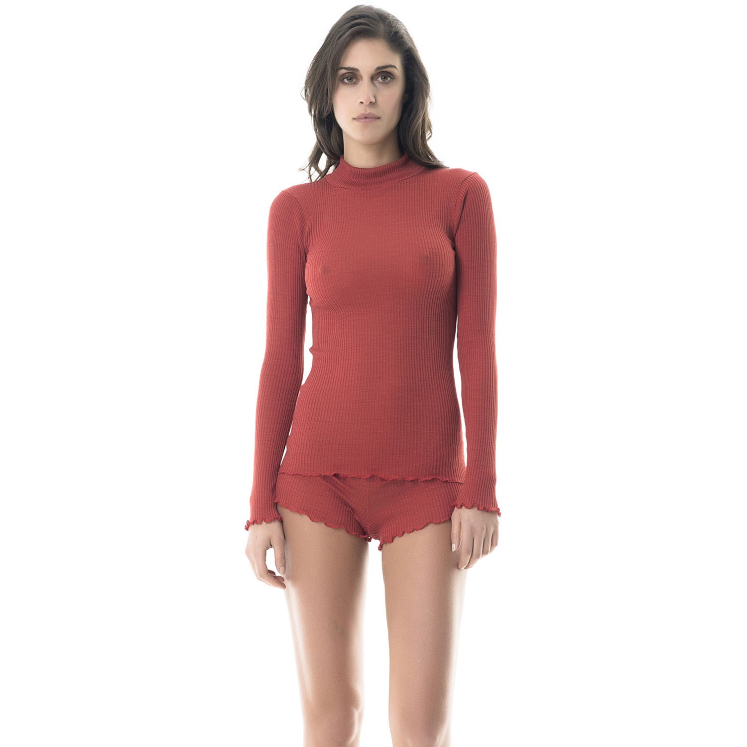 Women's t-shirt in fine wool and silk: warm and comfortable. Turtleneck design with long sleeves and seamless hem. Sophisticated comfort for your skin.