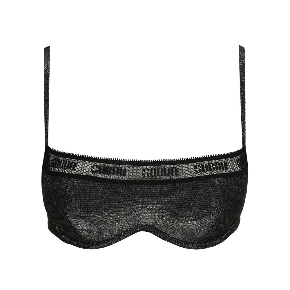 Shimmering, ultra-soft fabric with Sarda-branded lace trim. Thin straps along the bust make this bra even smoother and more comfortable. Available in cup sizes B to E. Black with a subtle sheen: a touch of sporty glamour for those who want to have it all.