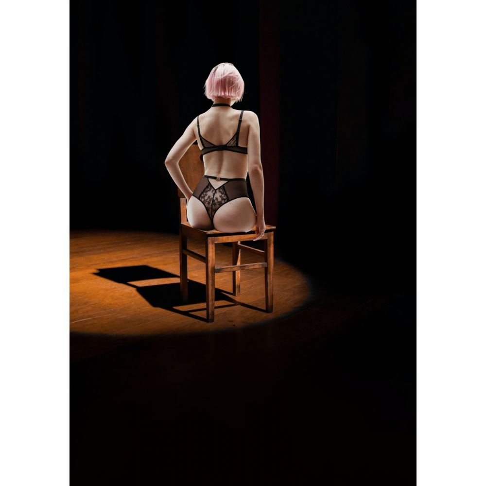 Back in tulle and floral lace, decorated with a triangle cutout and a jewel signed "X"