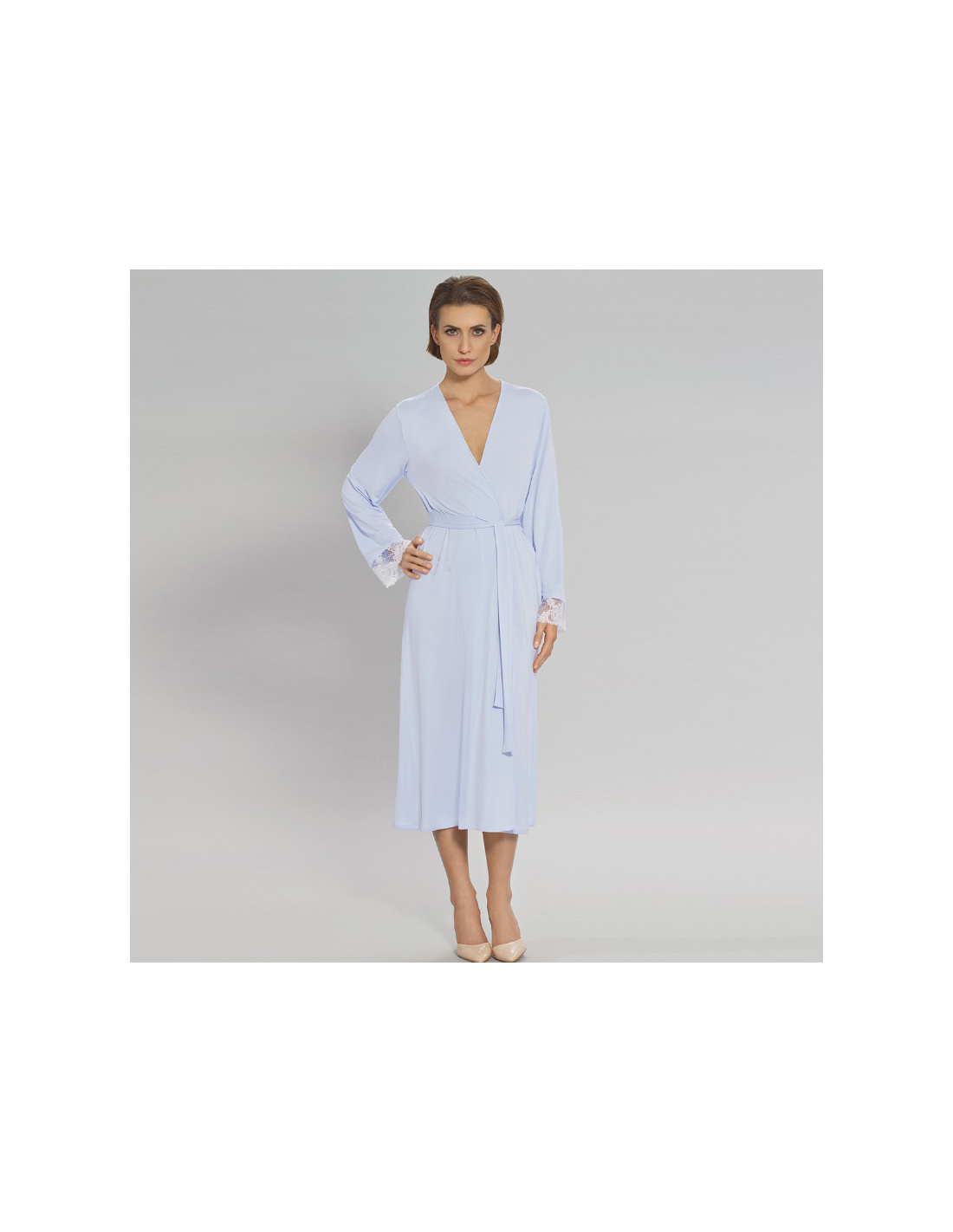 Classic, tied belt, knitted dressing gown. Long sleeves with delicate lace. Available in several colors. It is attainable in sizes XS / S, M / L, XL / XXL.