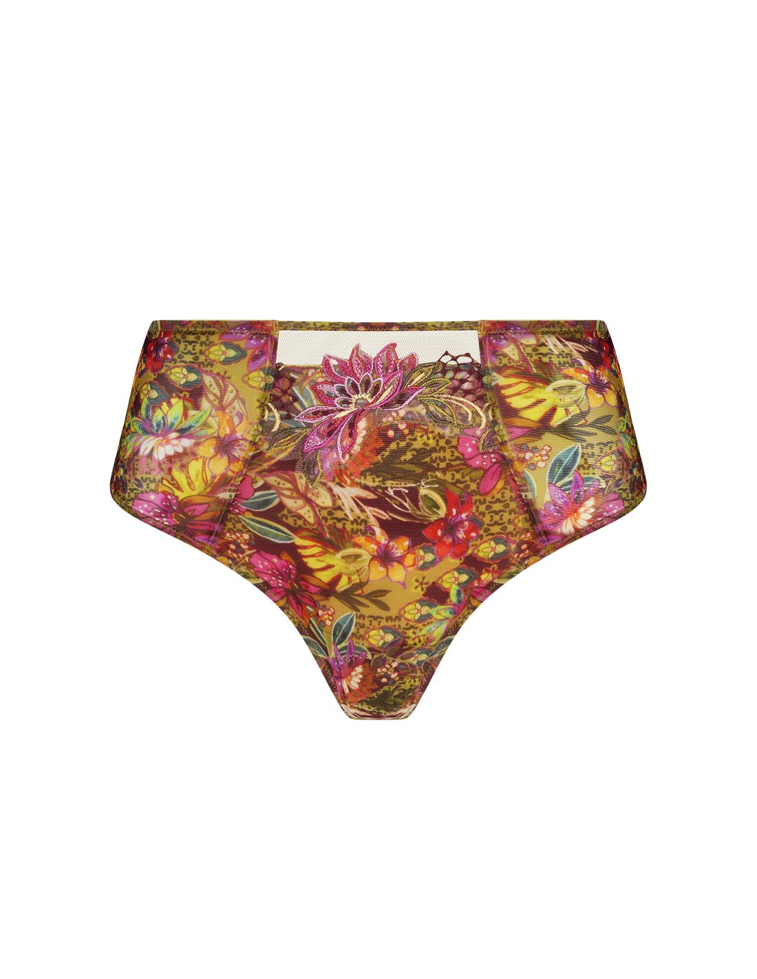 Shaping front panel for a tummy-flattening effect. Full-coverage back panel and wide sides. Maximum comfort. High-waisted briefs in very soft printed tulle with an embroidered panel at the center front, set against sheer tulle.