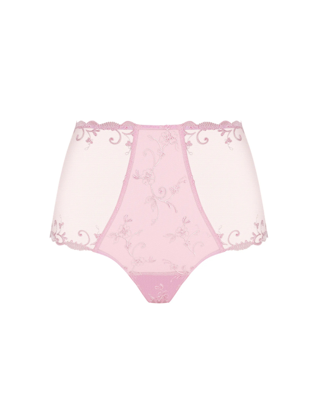 Sexy shape. Slightly reveals the buttocks and subtly hugs the sides. High-waisted, low-cut back, featuring embroidered trim at the side and a coordinating embroidered panel at the center front. The back is embellished with an embroidered panel and an invisible tulle triangle topped with three gold beaded rings held by elastic satin ribbons.