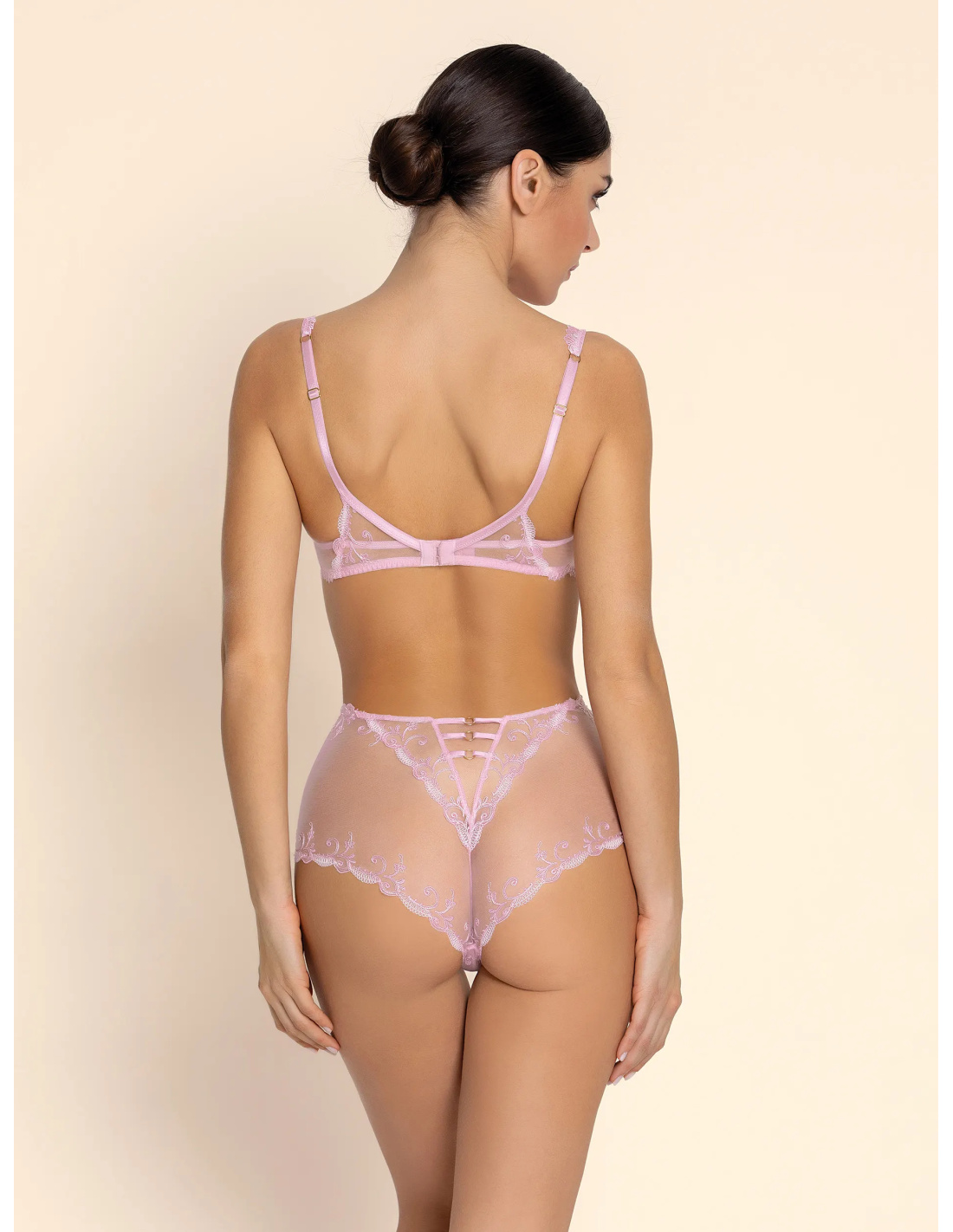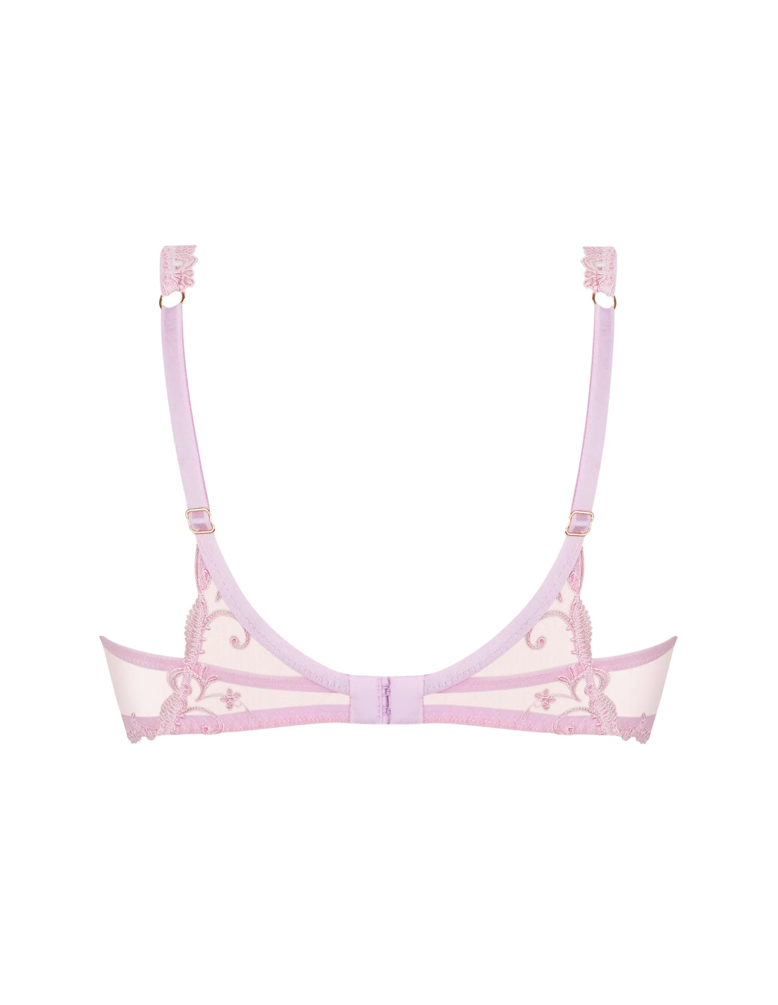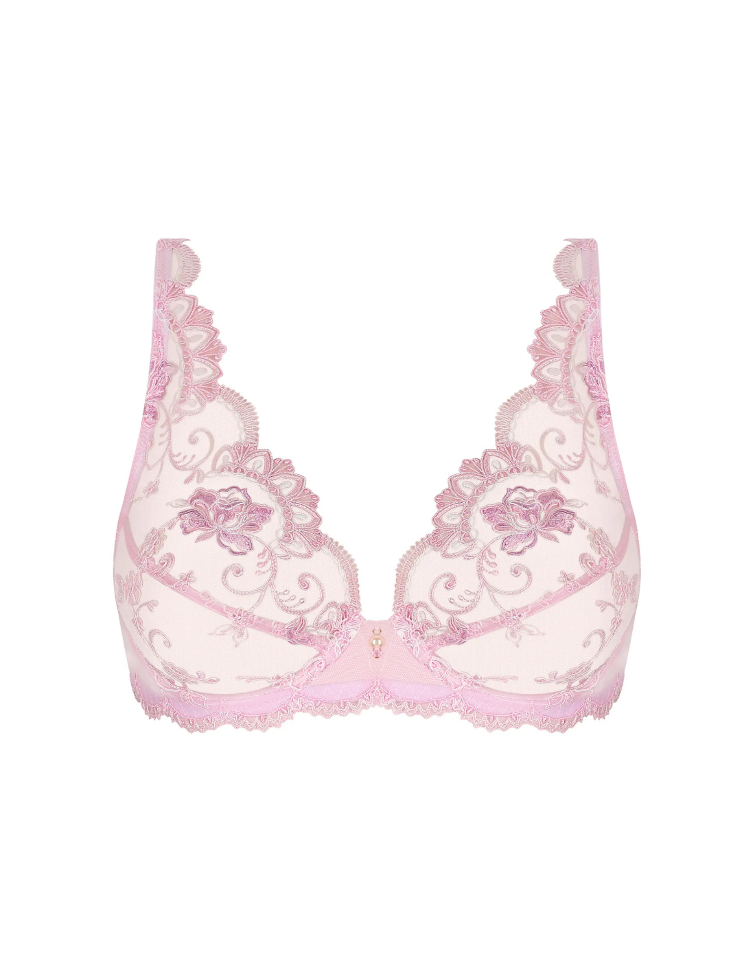 Scalloped embroidered cups across the entire neckline; multi-thread embroidery on invisible tulle. The underband, with its scalloped embroidered band at the front, is embellished with a scalloped embroidered trim at the back. The straps are adjustable at the back. The openwork V-shaped center gore is adorned with a pearl.
