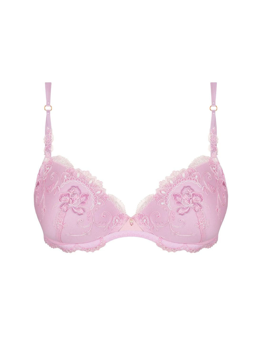 Cups in multi-thread embroidery on invisible tulle, scalloped at the neckline. The band, in scalloped embroidery at the front, is embellished with a scalloped embroidered trim at the back. The two-part straps are adorned with a floral embroidered motif at the base of the strap, then a metal beaded ring. The center gore is embellished with a mother-of-pearl bead. Detachable necklace sold separately.