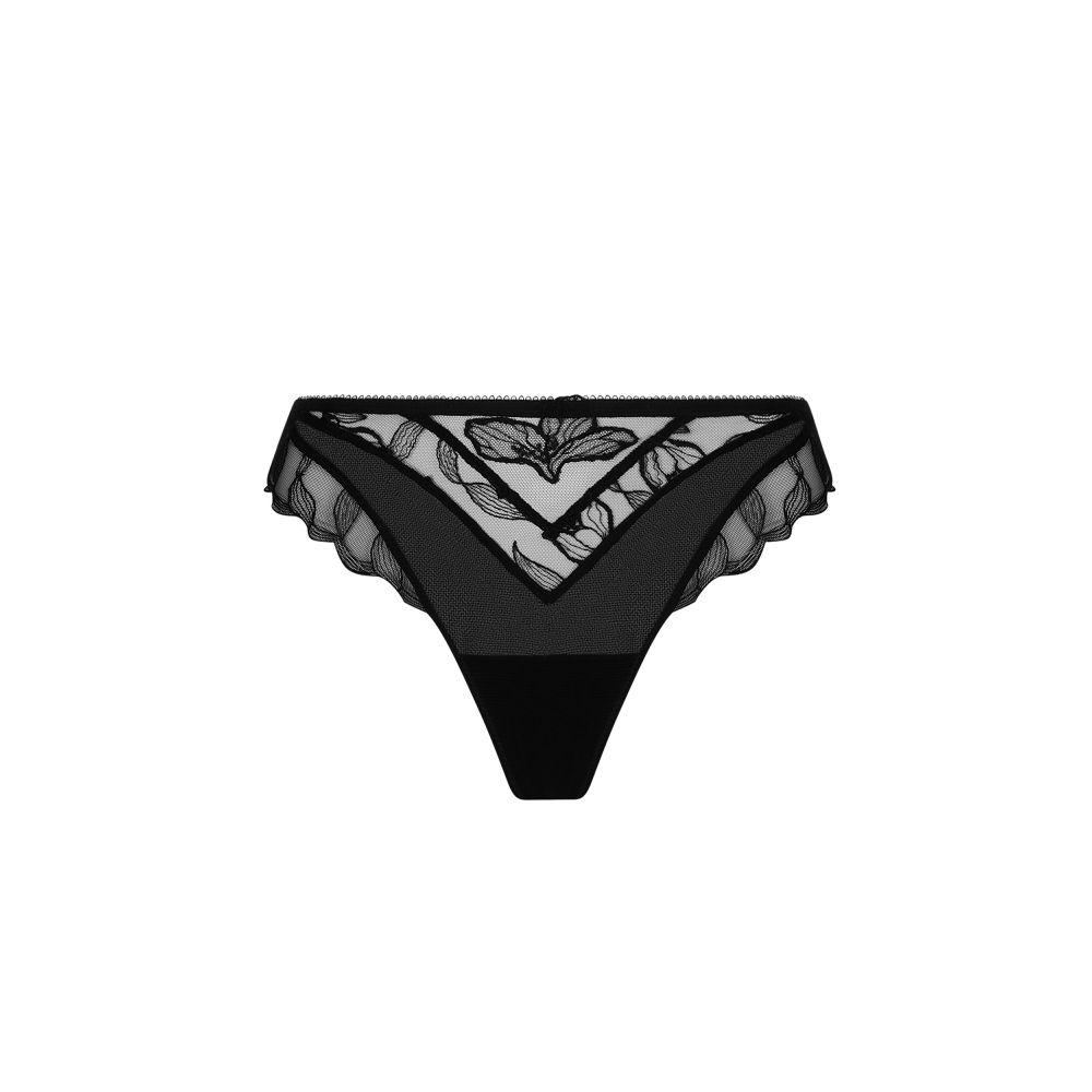 Thong in embroidered tulle with scalloped edges at the front and upper back. The front reveals a subtle sheer gradient thanks to tapered cutouts that play with different opacities. A delicate embroidered floral motif embellishes the center. At the back, a triangular cutout refines the silhouette and highlights a large embroidered floral motif.
