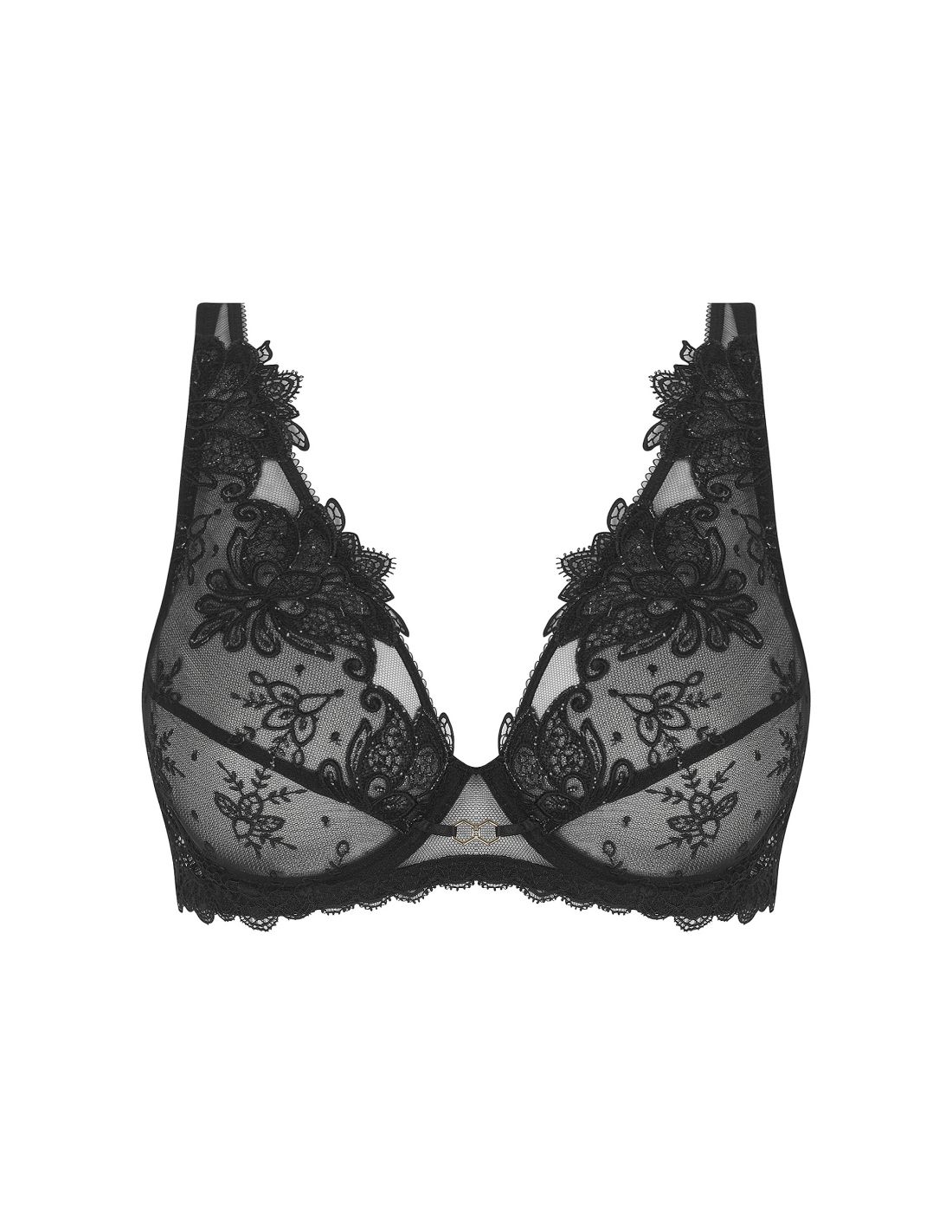 The upper cup features scalloped embroidery inset on crystal tulle, while the lower cup has a matching embroidered band.