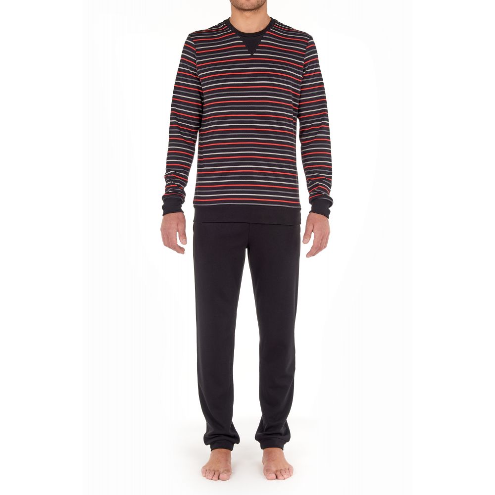 The TORONTO men's pajamas are long pajamas for men with a sailor-style print, red, light gray and dark gray stripes on a black background. Made of 100% cotton interlock, this set with an elegant and sportswear style is ultra-comfortable