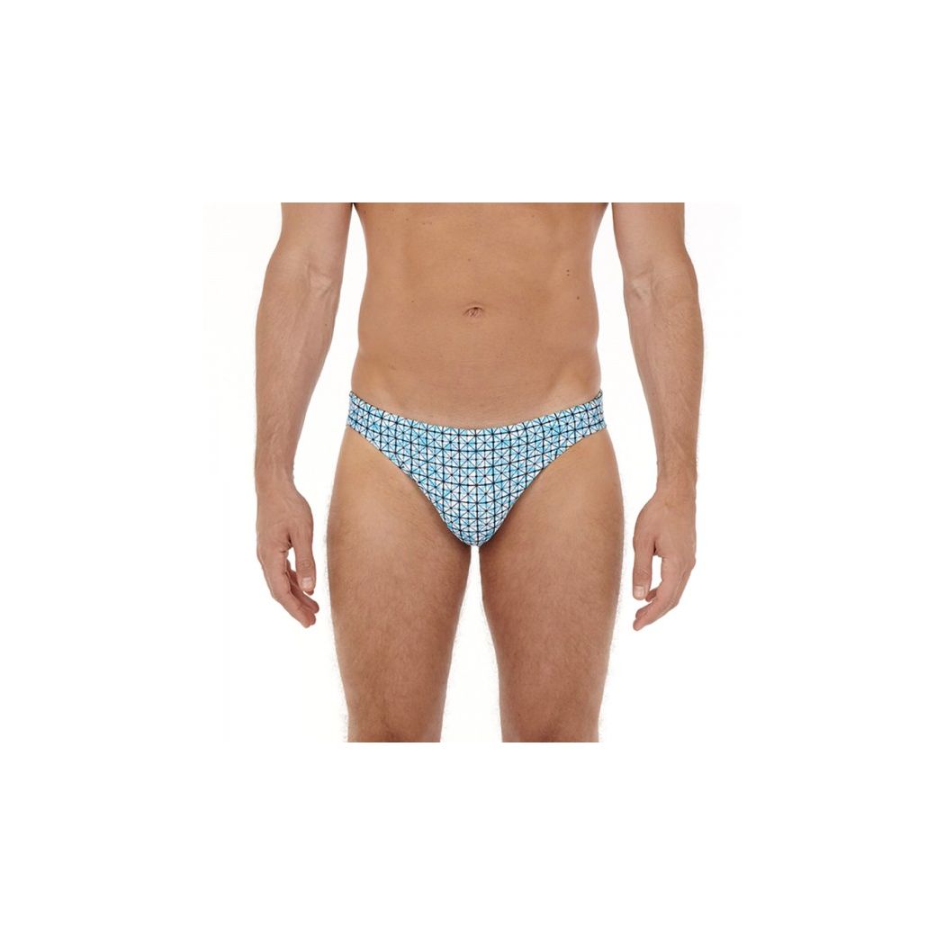 The AUSMANE swimwear line is adorned with seasonal colors for an original look. These men's swim briefs feature a geometric print in shades of blue and yellow.