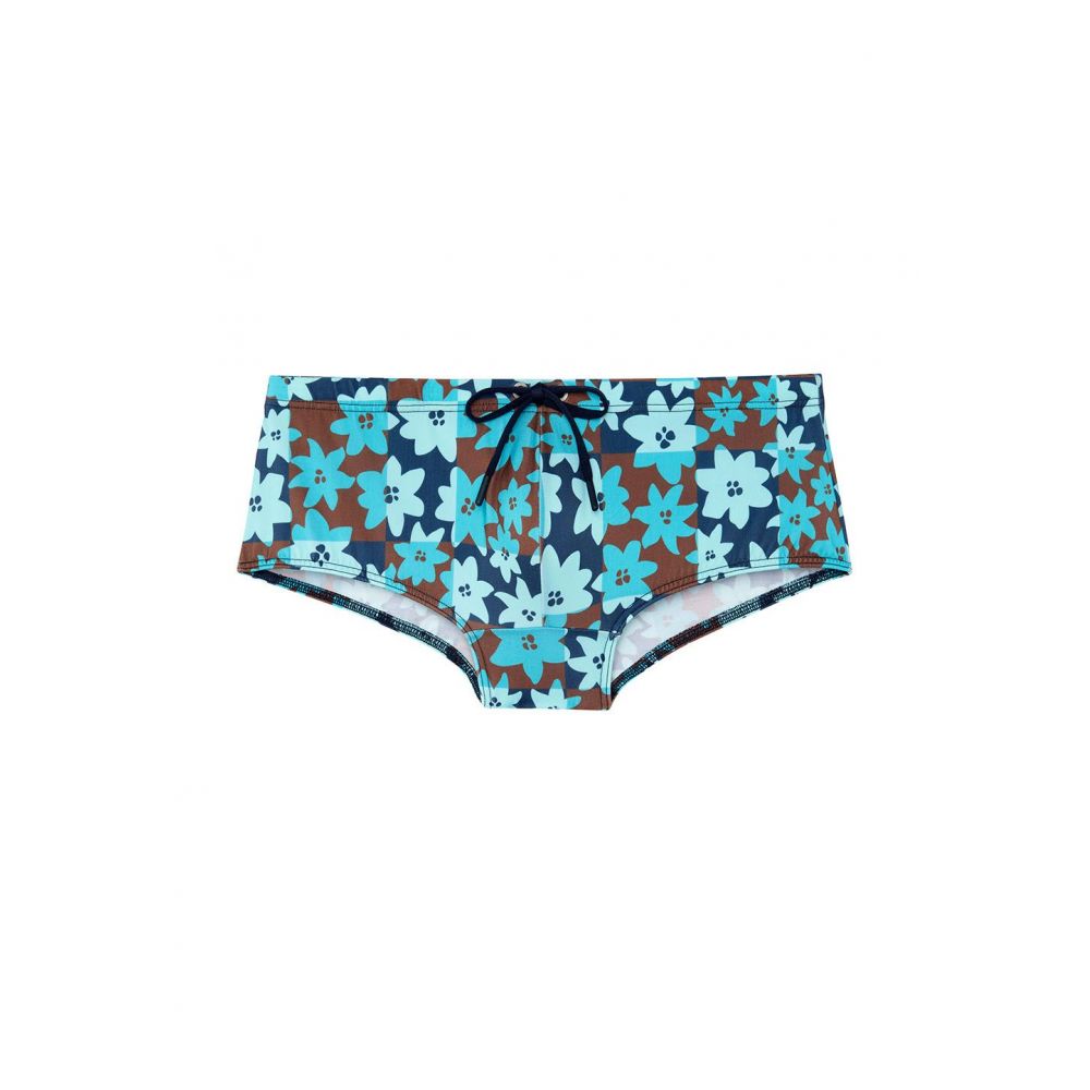 The MERVYN men's swim shorts have an aesthetic that is as strong as it is soft. The print consists of sky blue or turquoise blue flowers, superimposed on blue or brown squares.