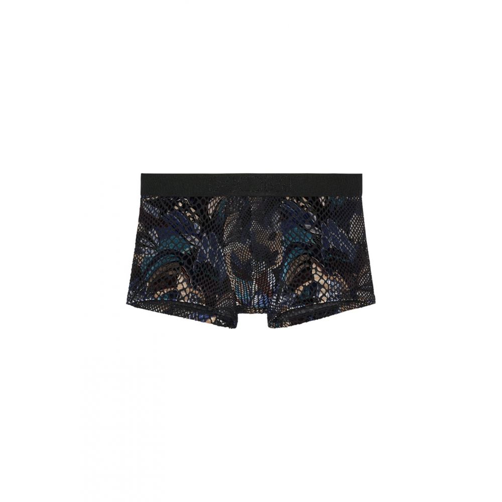 The COBRA men's boxer briefs feature a shorty cut, ideal for enhancing the masculine silhouette while ensuring great freedom of movement. This piece of men's lingerie features a hemline inserted into the seam—a finely elasticated hem—which provides excellent support without marking the skin, keeping the underwear in place all day long. These sexy men's boxer briefs are made of polyester and microfiber, with a polyester inner lining for increased comfort. But it's their burnout velvet finish that makes all the difference: this textile process reveals a subtle interplay of snakeskin-effect patterns, combining transparency, reflections, and texture, evoking both chic eroticism and extravagance. Fluid, soft, and slightly satiny, this fabric seamlessly hugs the body for a next-to-skin feel. The style of the COBRA lingerie boxer briefs combines boldness and refinement: its shimmering colors, textured effects, and animal prints evoke a resolutely bold world. The elastic waistband, discreetly bearing the HOM logo in lurex threads, adds a precious and luxurious touch without sacrificing comfort. Designed as a piece of men's lingerie, the COBRA boxer briefs are sexy underwear that fully embraces its style: bold, elegant, and sensual.
