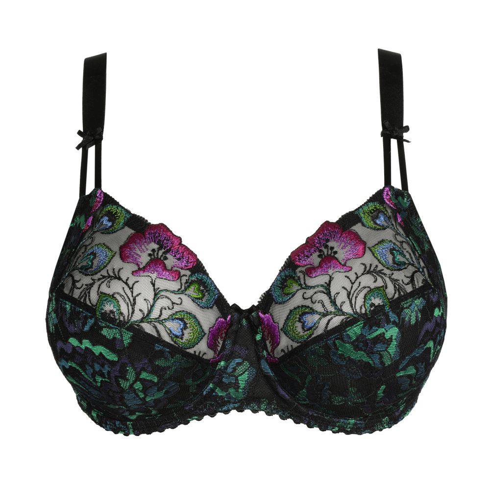 Full cup bra with underwire and tulle lining in the cups which gives it a strong support. This cut covers the breasts completely. Peacock Feather is a mix of intense colours. Warm fuchsia, intense blue and green contrast beautifully with the black base colour.