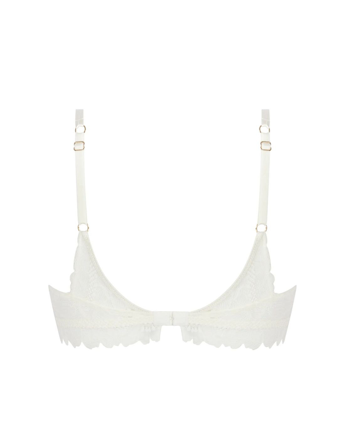 Cups in embroidered organza trim embellished with scalloped lace trim at the neckline. Back band and yoke in jacquard lace trim. Front strap in open spaghetti straps, adorned with a two-panel organza bow. Center gore in invisible tulle over lace, embellished with a bow and a gold-tone rhinestone jewel. Gold-tone rings and sliders.