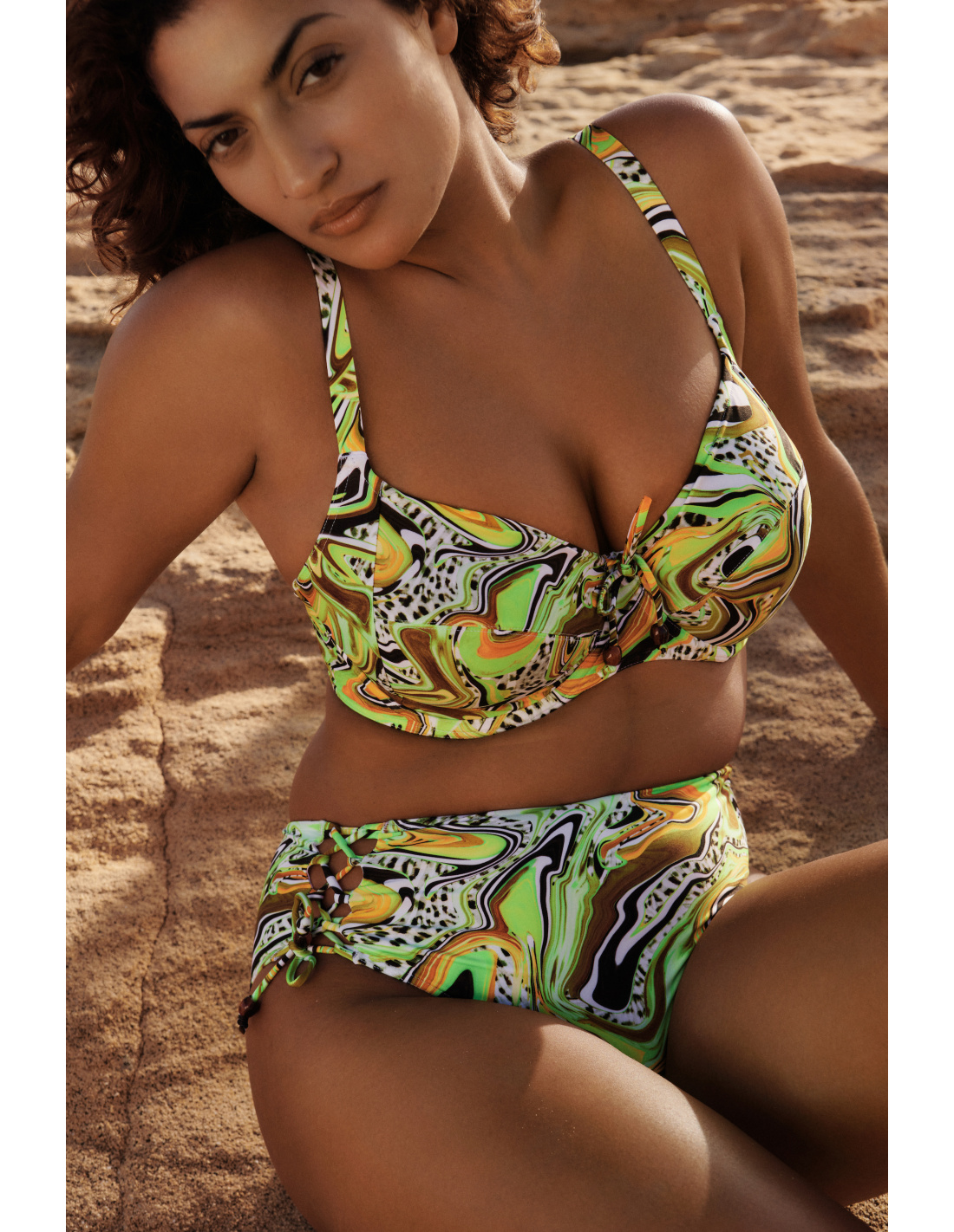 Trendy underwired swimsuit top with retro three-piece cups. It is made entirely of terry cloth and has a very trendy 90s look. With the tie ribbon you can adjust the cups yourself so that they always fit perfectly. Lime Swirl is a psychedelic print in yellow-green hues that looks beautiful on the skin. Haute couture for those who dare!