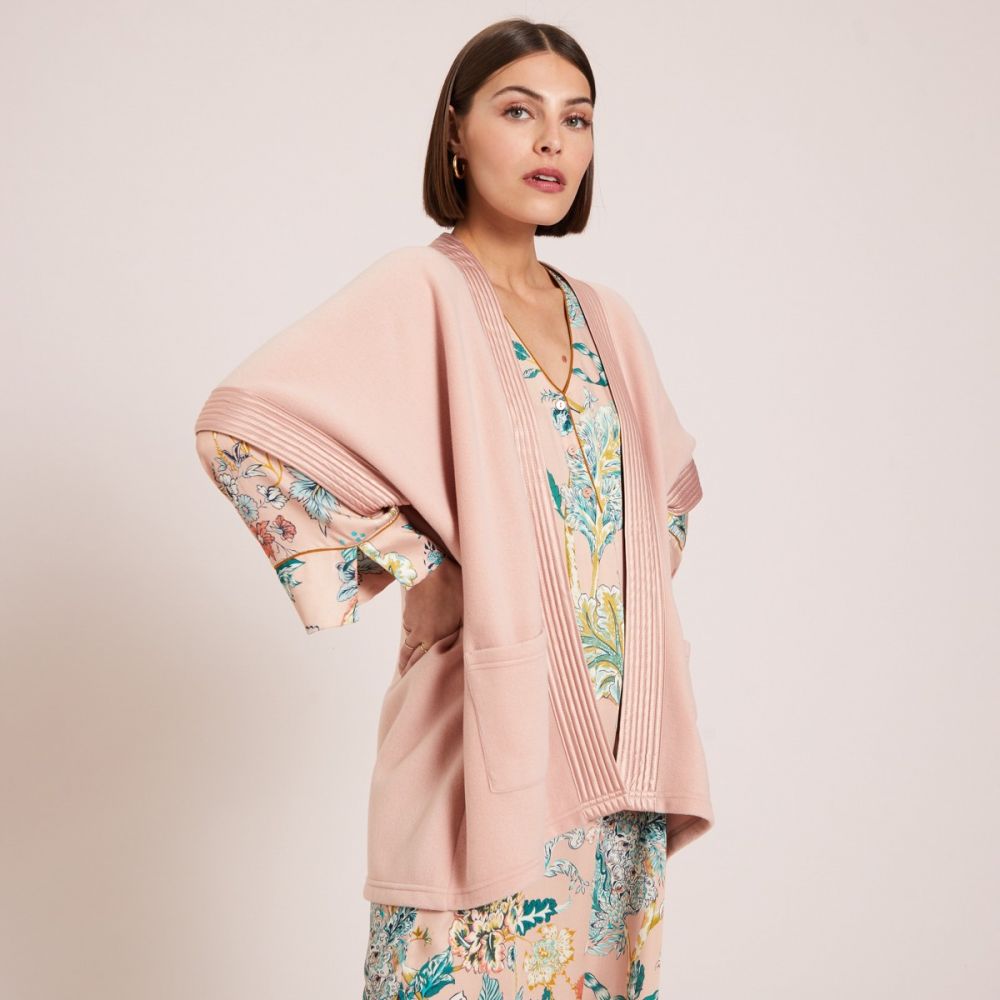 Neckline and cuffs in tone-on-tone topstitched satin