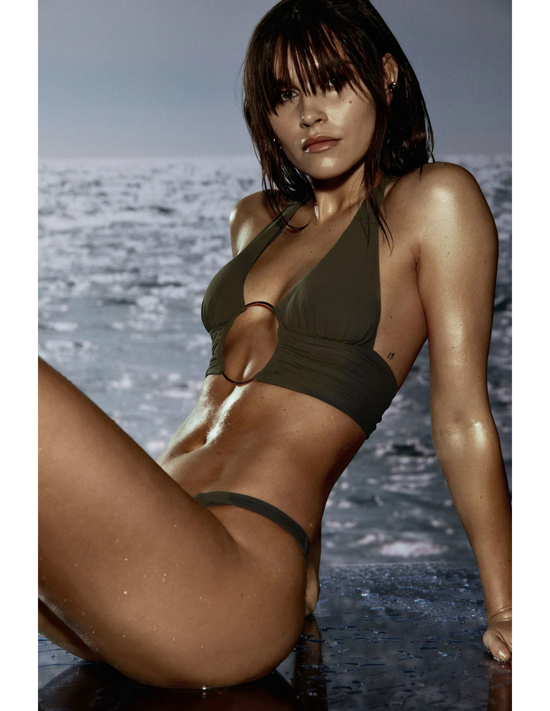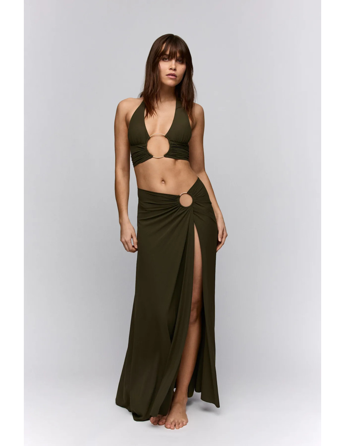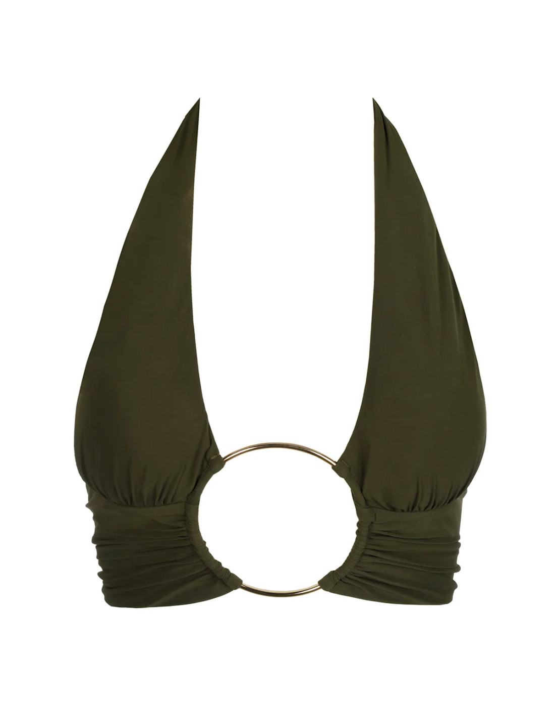 Wear it to the beach or accessorize; this top goes with everything. Olive green, forever hot. One-back style.
