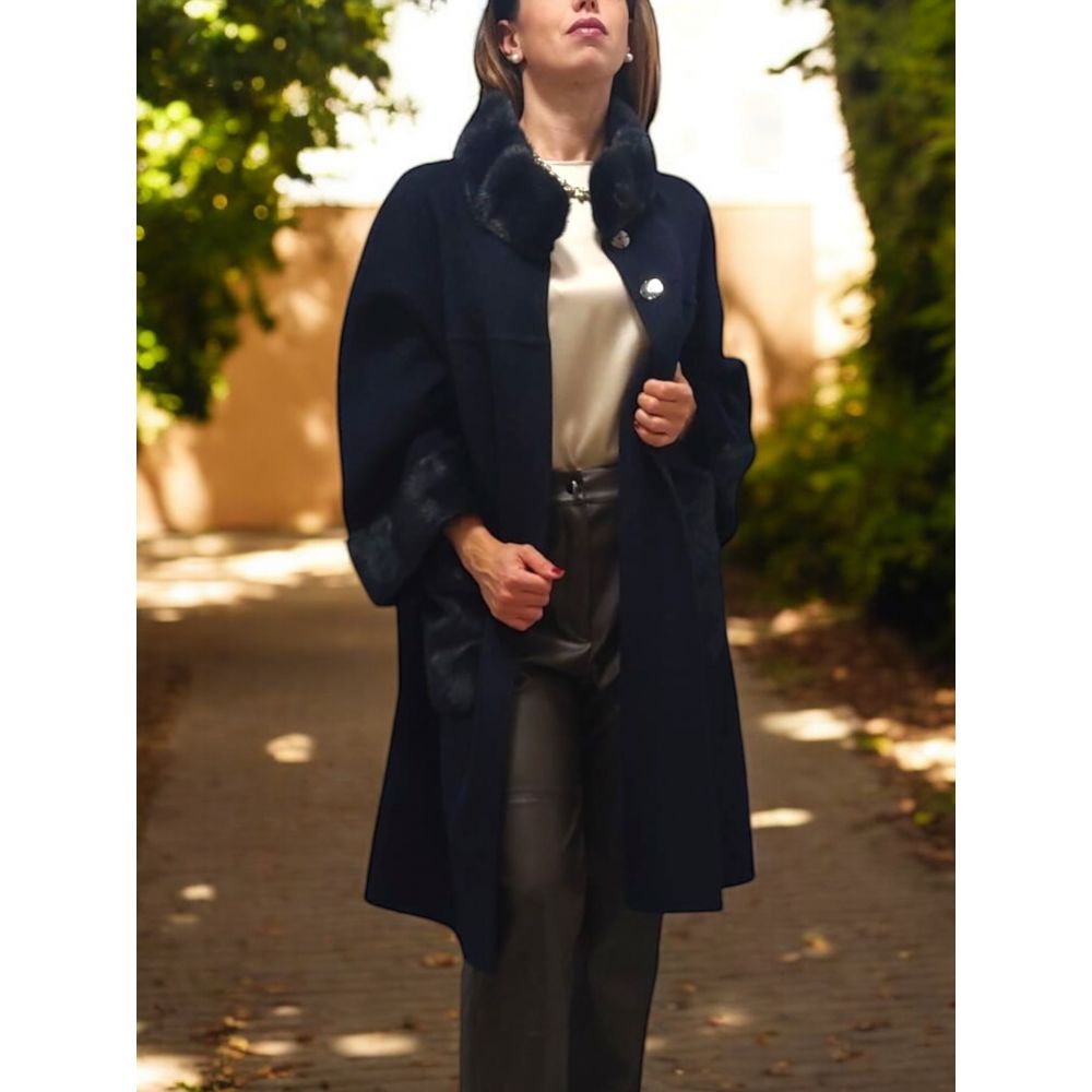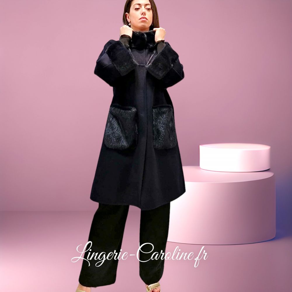 This 3/4 double-breasted coat in 100% wool with mink collar and sleeve pockets in midnight blue will be your essential partner to accompany you throughout the winters.