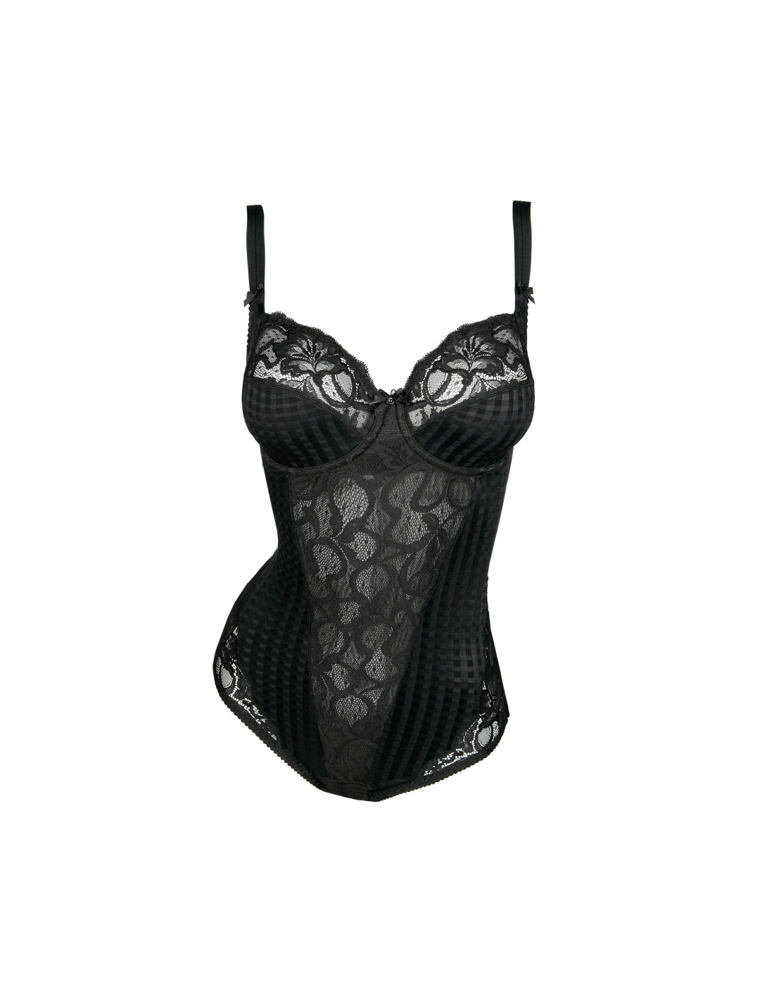 Elegant figure-fixing body without cups with sexy embroidery details on back and leg opening. Goes with any bra.