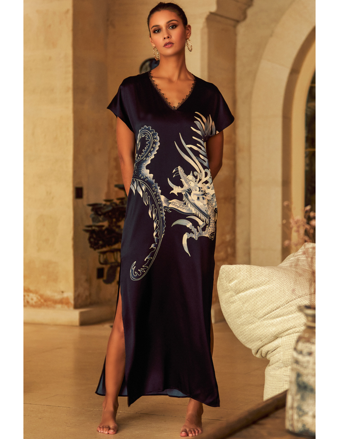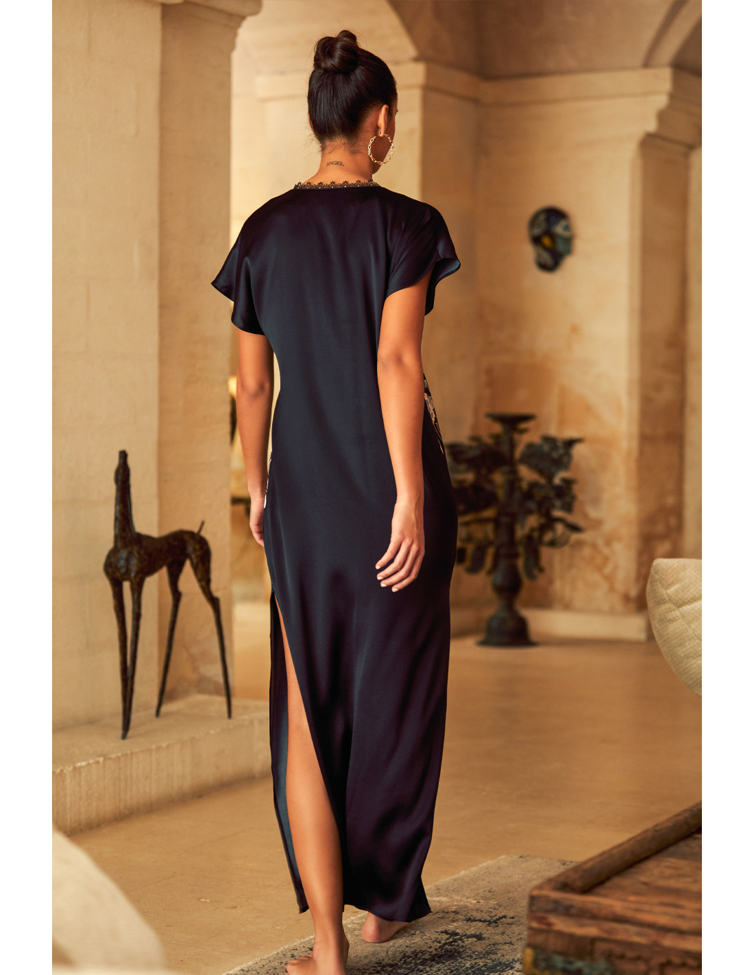 A nightgown with luminous reflections whose delicate silk satin will envelop you in softness. This piece is uniquely elegant with its patterns and encrusted embroidery at the edge of the sleeves and along its neckline.