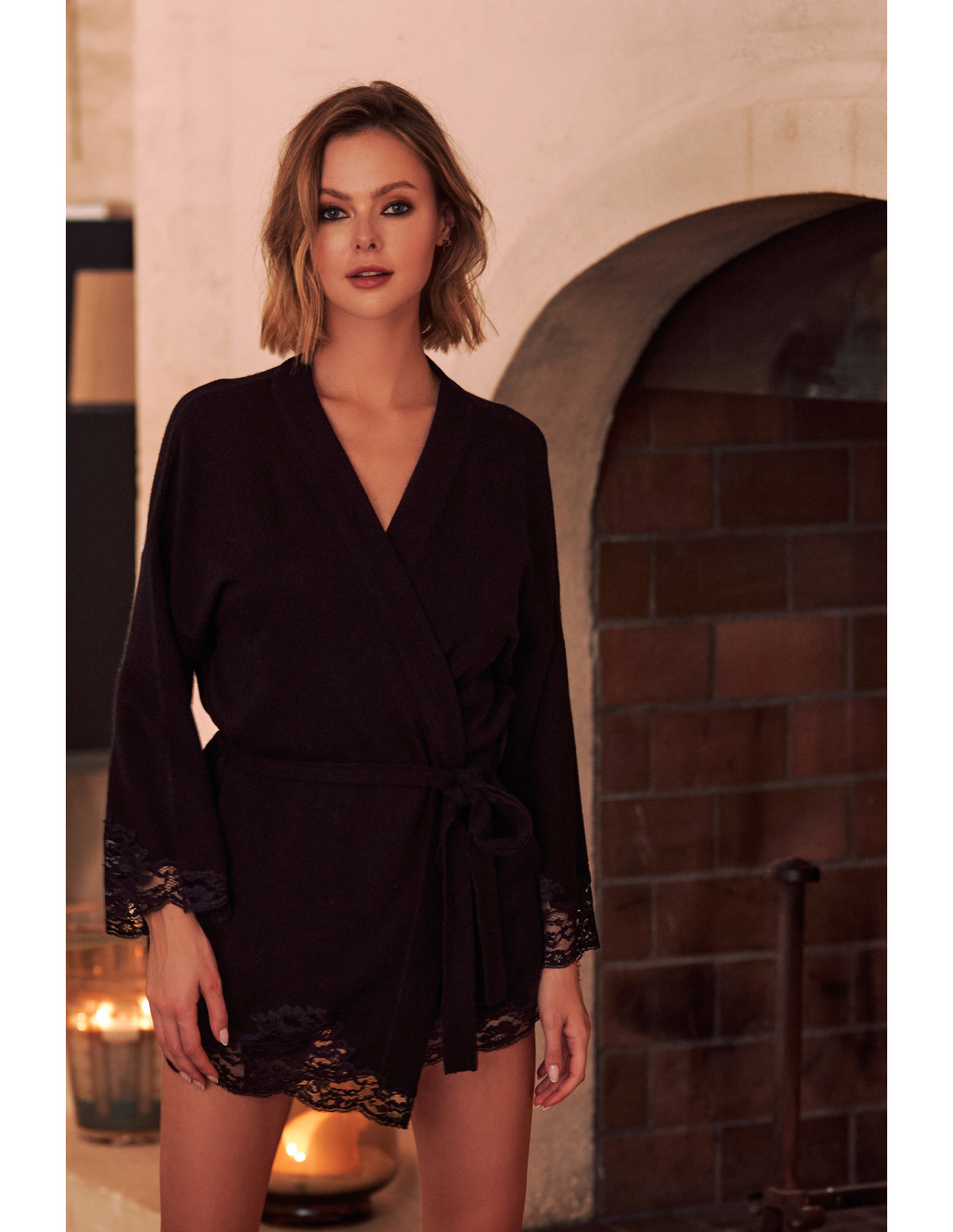 The Sonia cardigan is exceptionally elegant, its soft and refined cashmere is meticulously inlaid with Calais lace at the edges of its sleeves and hem.