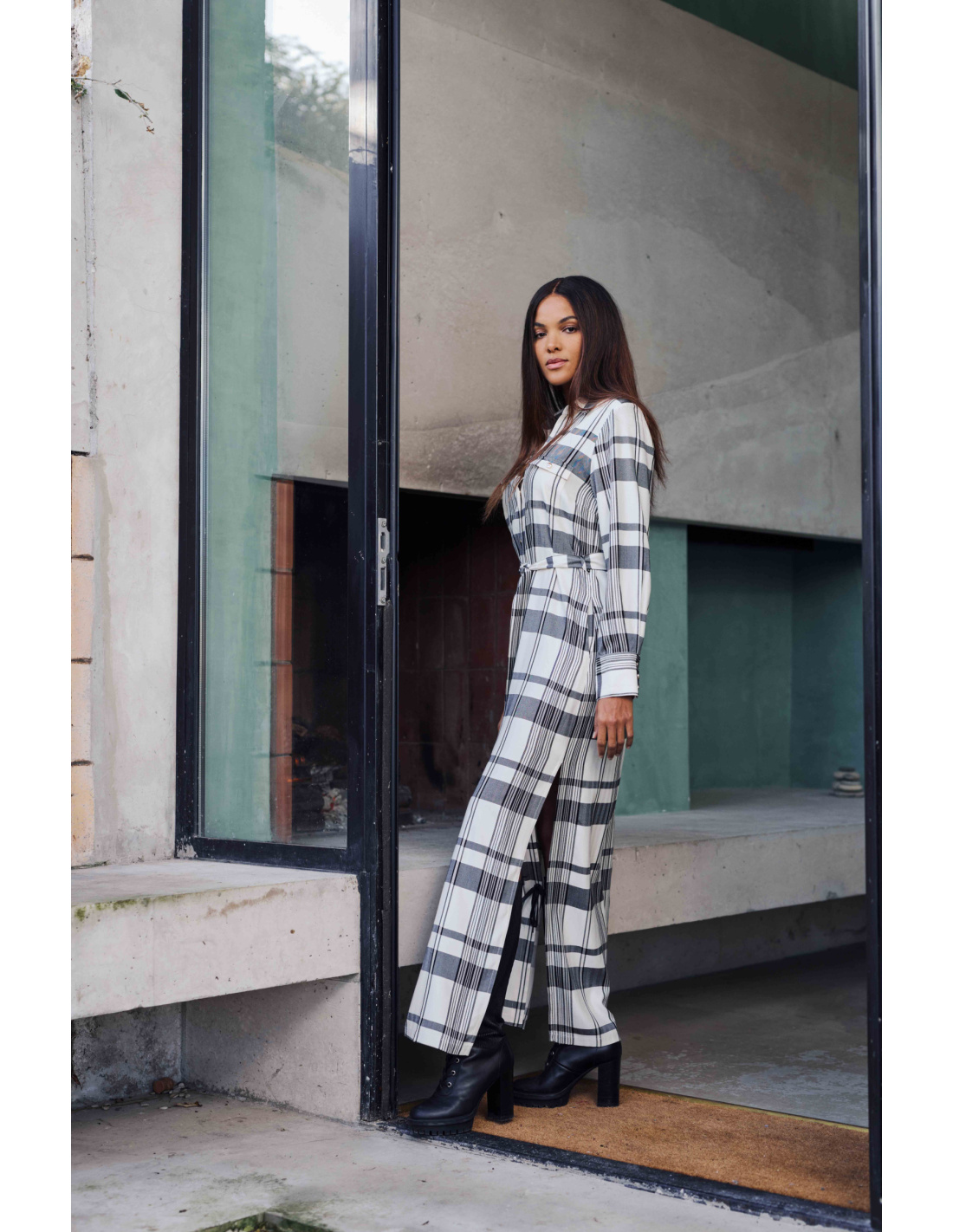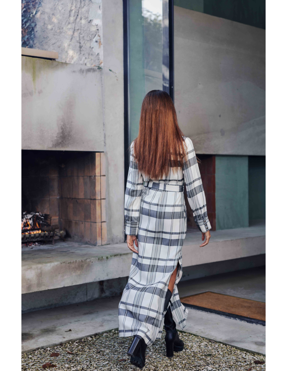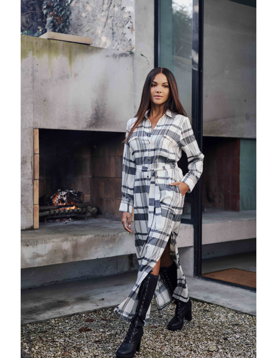 Assert your style with the Brigitte long shirt dress, a true statement piece this season. Its bright tartan print blending shades of beige, gray, and black offers a subtle and sophisticated graphic effect. It fastens with a row of discreet snap buttons on the front and is belted at the waist to elegantly structure the silhouette.