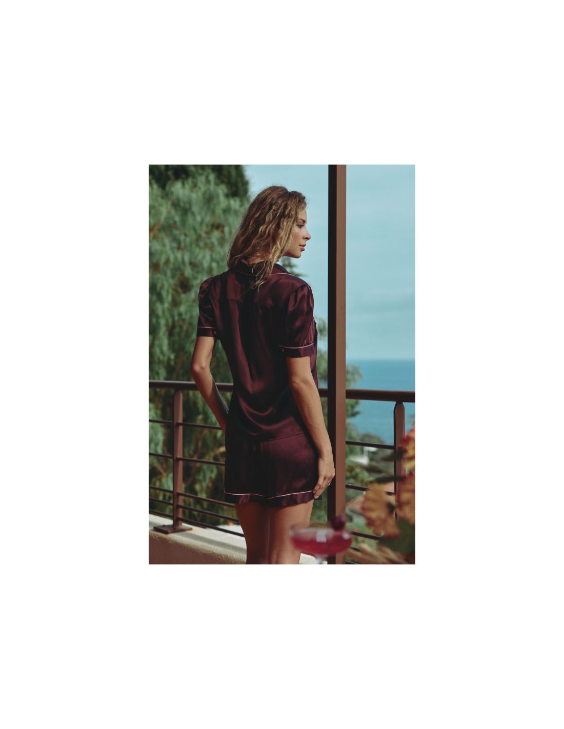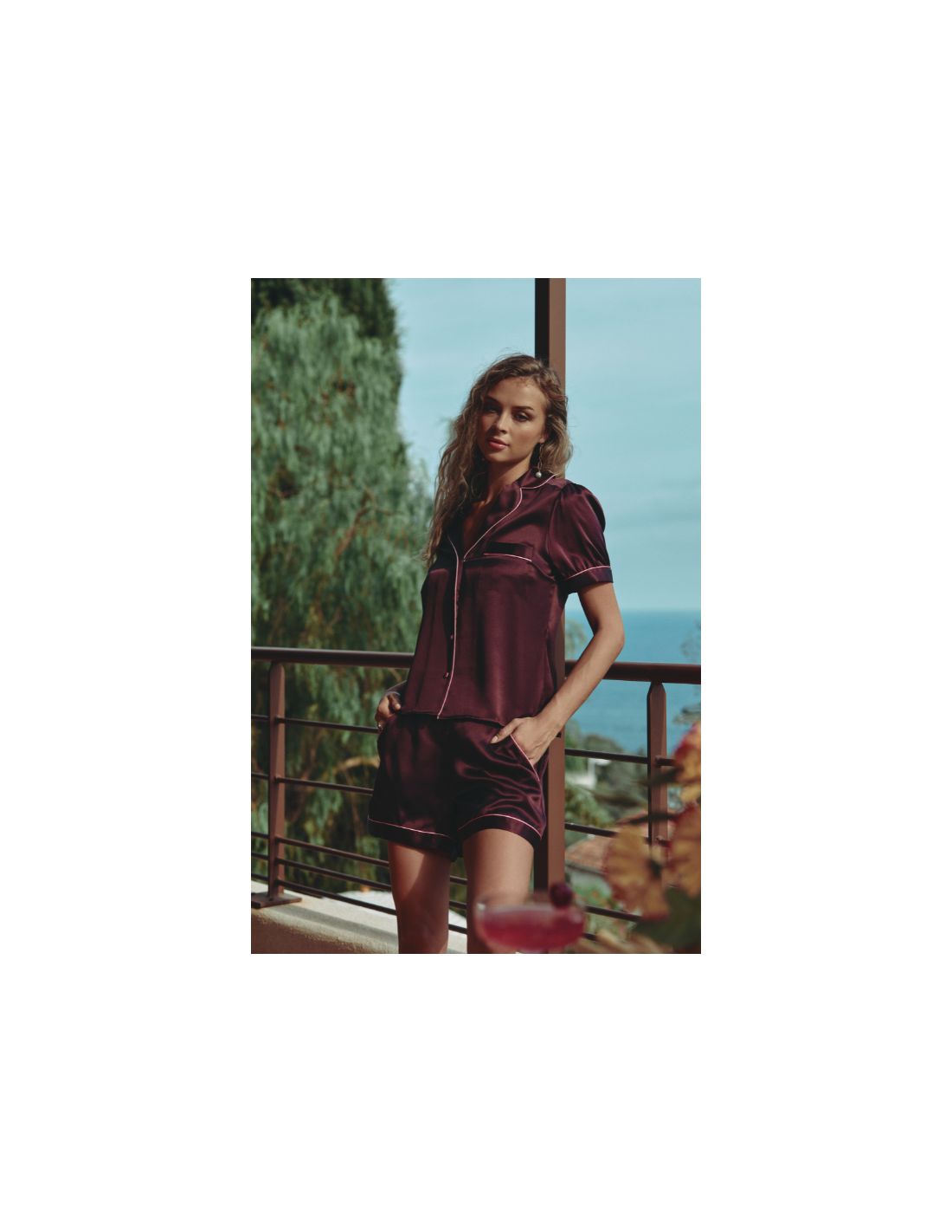 Short pyjamas in brown silk satin, delicately trimmed with blush pink piping. An elegant and fresh look, ideal for sophisticated nights.