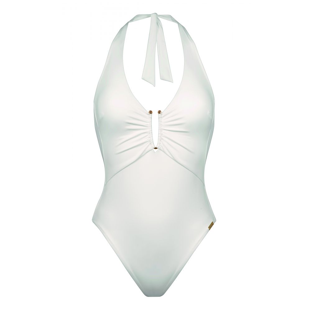 Underwired swimsuit with a deep V neckline and a decorative element at the cleavage. Gathers at the waist. Fully lined. 72% polyamide, 28% elastane.