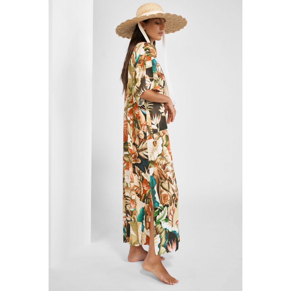Inspired by the hypnotic effect of structured Zen gardens with its clear, organic lines, the print's imagery combines overwhelming tropical leaves and noble color worlds inspired by nature with nostalgic feelings. Almost as if given a golden sepia filter, the colors appear warm and sunny, reflecting a sophisticated palette of calming natural hues. The elaborate composition invites you to take your time to discover all the details and the link between color, Zen work and textile art. This exceptional handcrafted work explores the best of calming weaving techniques. Long caftan with V-neck and overcut sleeves. 100% Viscose.