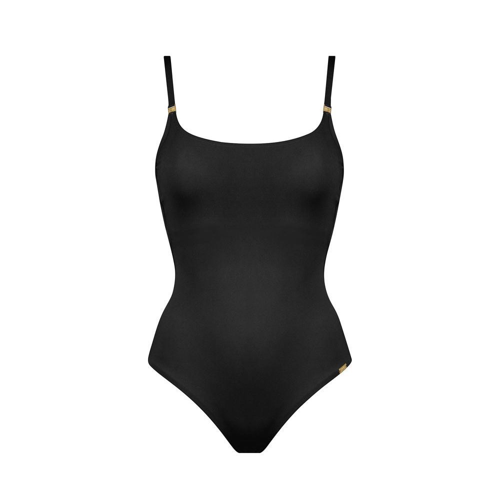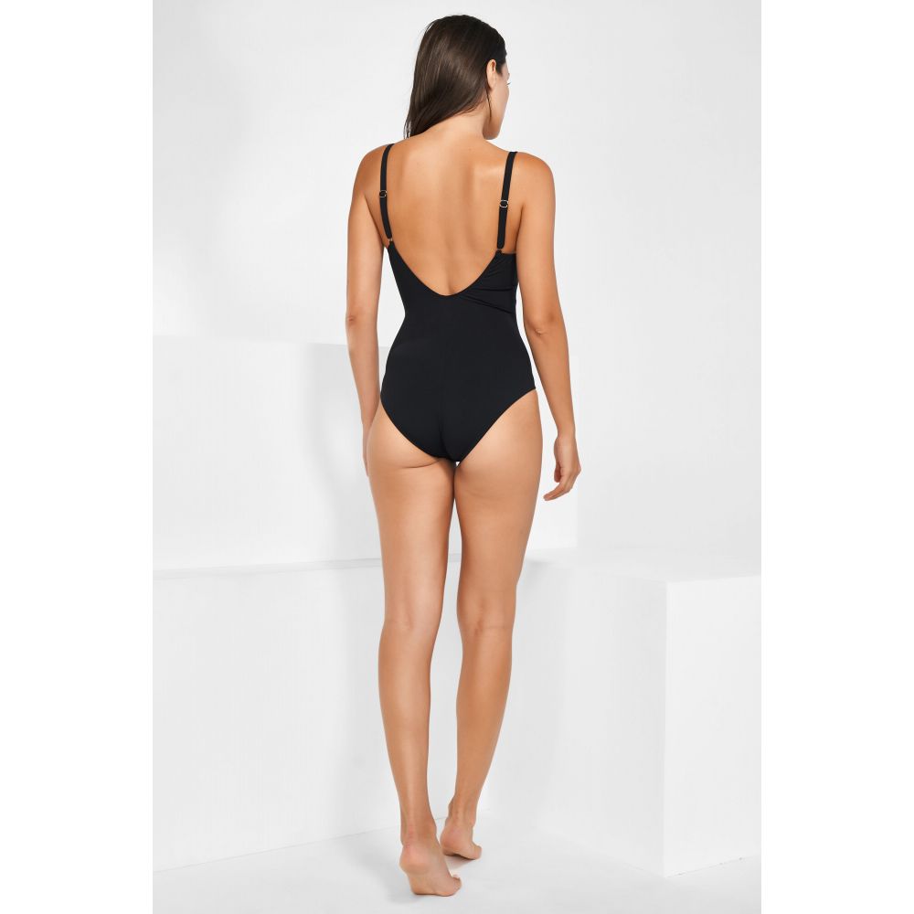 MARYAN MEHLHORN presents a new collection made from innovative natural materials. This sustainable collection replaces the previously used polyamide with plant-based raw materials from 100% renewable sources. This innovative material is 25% less harmful to the environment and 100% free of crude oil. Its patented, environmentally friendly production process reduces water consumption by 25% and CO2 emissions by 20%. The yarn is made from castor oil and does not come from crops grown for human or animal consumption. Planting this 100% renewable resource requires neither large amounts of water nor potentially arable agricultural land. Castor oil is extracted from the seeds of the castor oil plant, Ricinus communis. This style also embraces the sustainable philosophy of "less is more in the long run": sleek silhouettes in classic black and natural moss green. Swimsuit with padded cups, featuring a simple yet bold design. Adjustable straps and subtle details. Fully lined. 80% polyamide, 20% elastane.