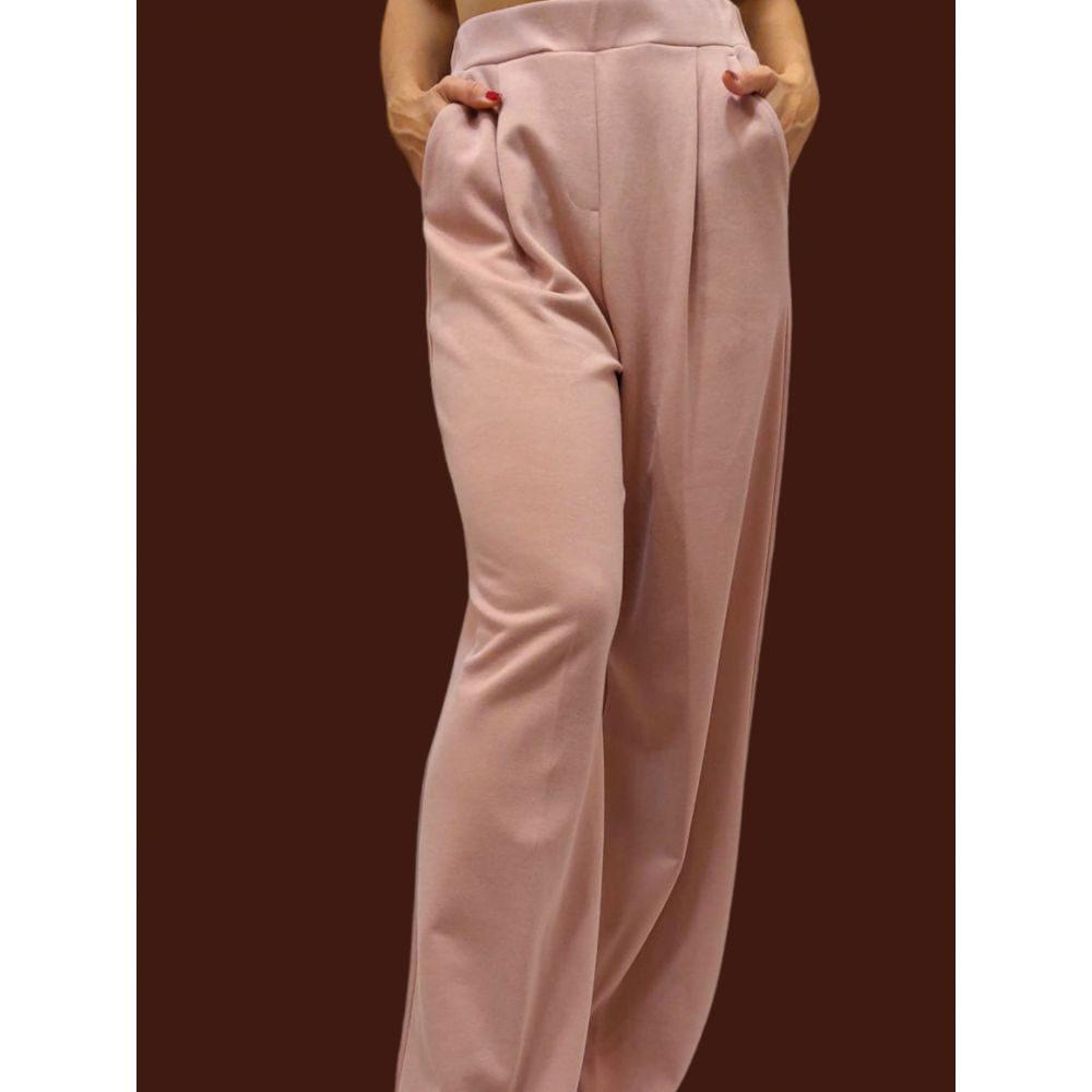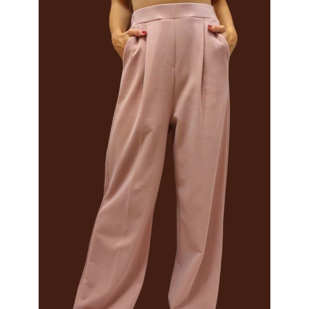 Cotton jersey pants with a wide cut, elasticated waist, pleats with pleat on the leg and side pockets. Length: 110cm.