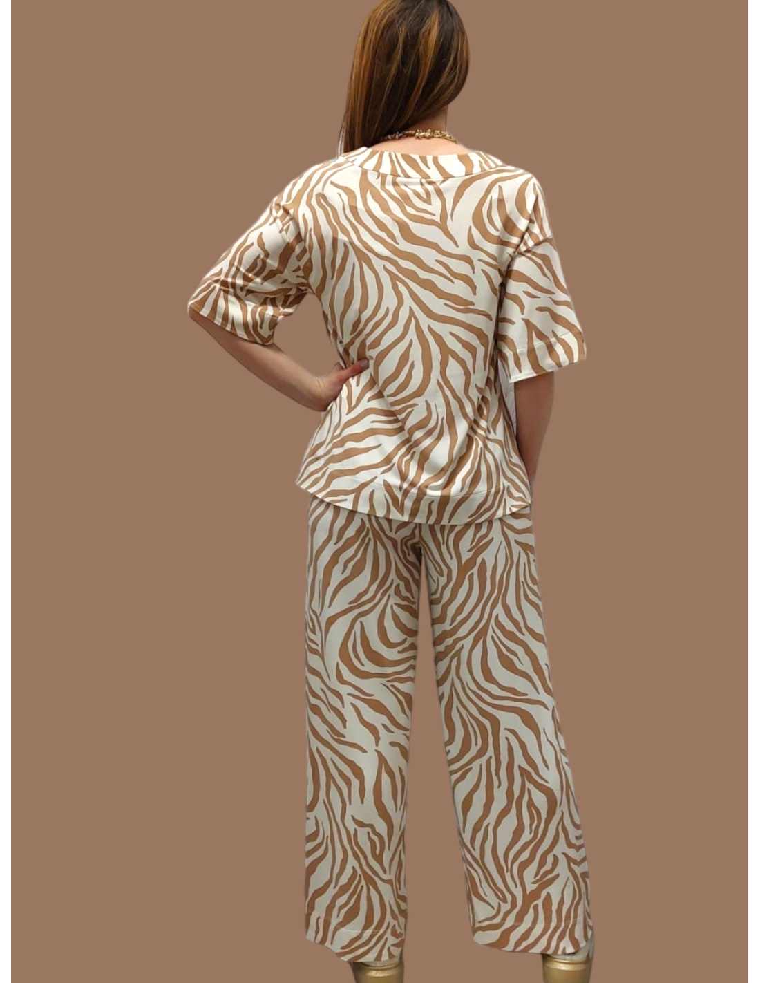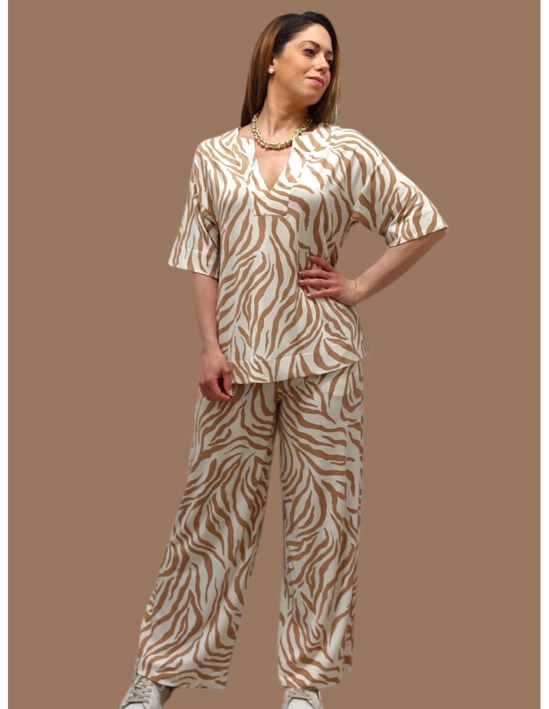 Soft, supple, comfortable and fluid, this short-sleeved animal print top goes perfectly with its REBUS pants