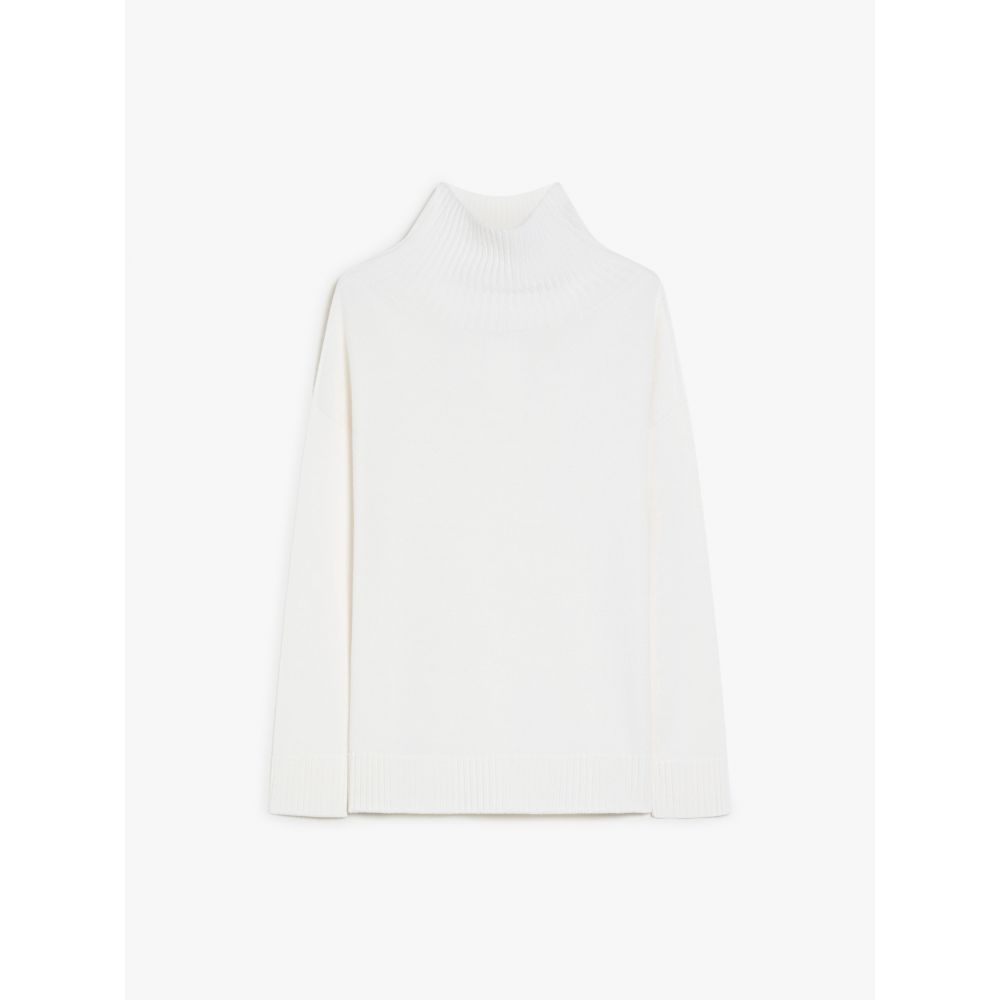 A jumper with a flowing cut, made of refined pure wool shear yarn. The model is characterised by a high collar and long sleeves with low armholes. Finely ribbed edges.