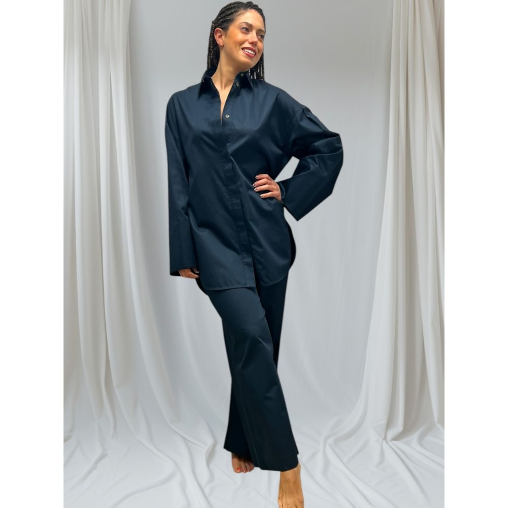 Pure cotton satin shirt. It has a shirt collar, long sleeves with a neckline and a yoke on the back. It has round slits and the back is longer than the front