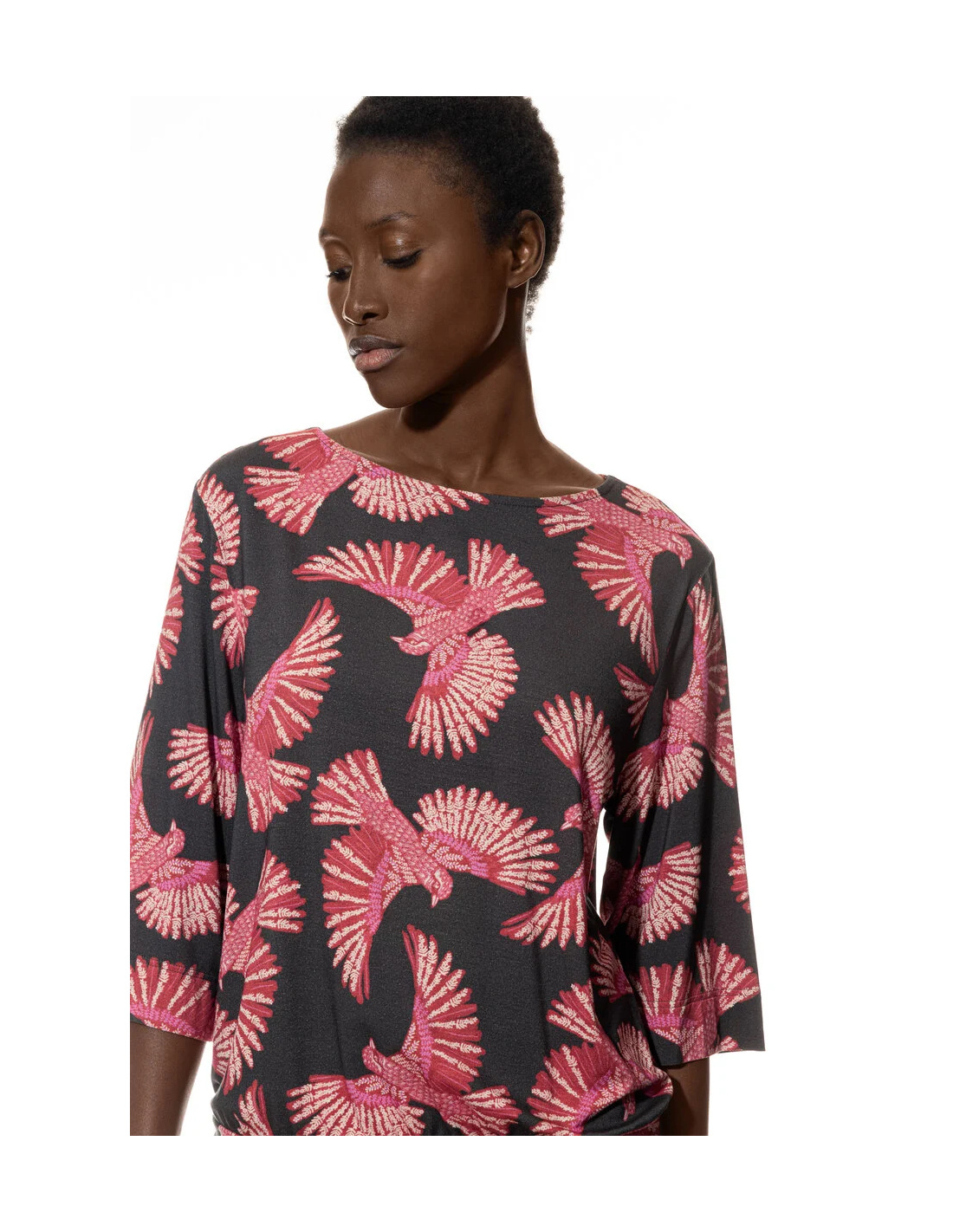 This fashion piece is a wardrobe essential - our 3/4-sleeve T-shirt in Thunder Grey from the Flying Bird series. In addition to a large bird print, the shirt also impresses with its particularly soft feel. Thanks to the fine fibres, textiles made of modal feel extremely soft and smooth. The shirt can be combined with bottoms from the Flying Bird series for an all-over look or simply worn with plain-coloured bottoms in Thunder Grey (a classic neutral colour) from the Pure Chic series. At mey, we are consistently investing in first-class quality, and use our expertise in underwear design to ensure the perfect fit.