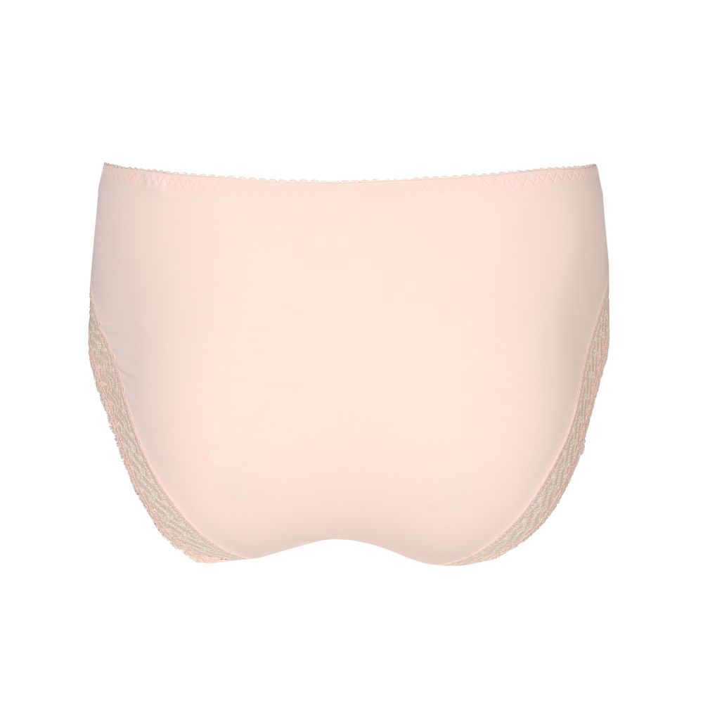 Elegant high-waisted panties in smooth fabric, displaying strips of lace that extend from the front to the back. Powder pink Crystal Pink is fashionable, feminine and easy to match.