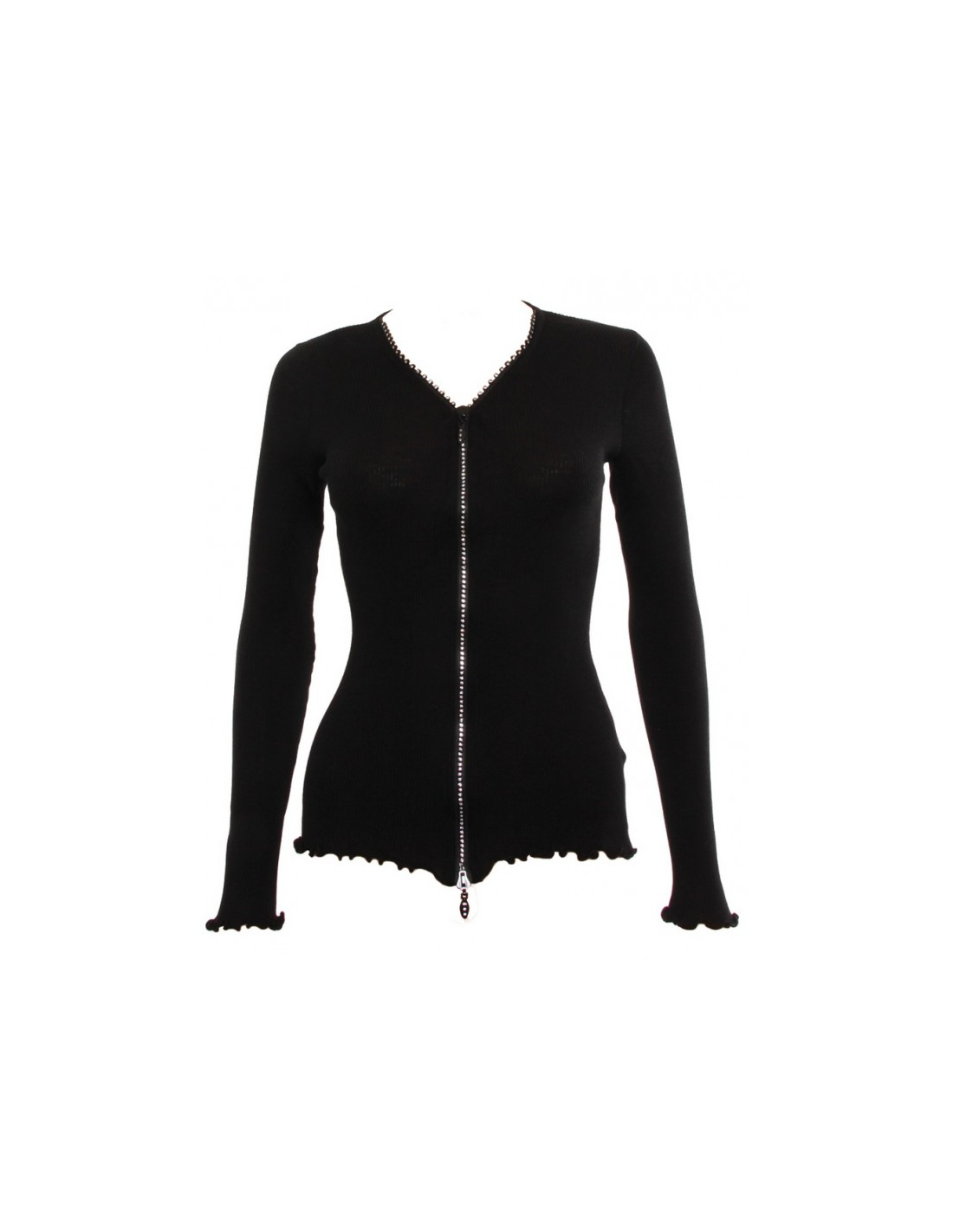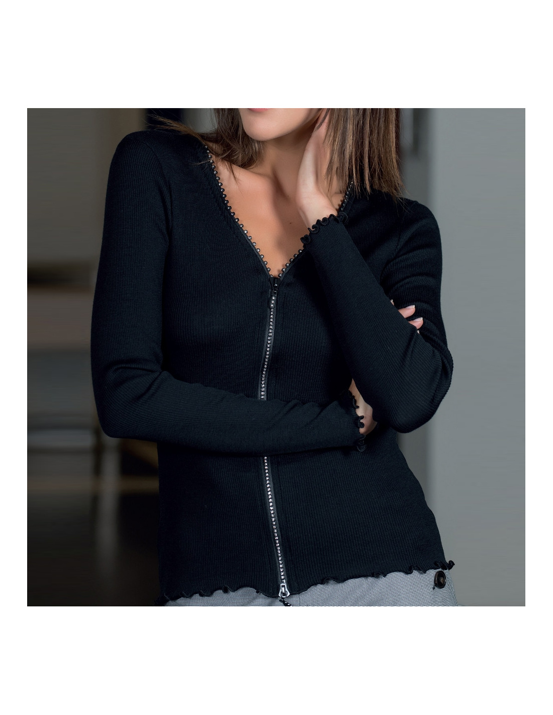 Gilet Zip Strass Manches Longues, 85% Laine 15% Soie, Moretta 5391-NERO