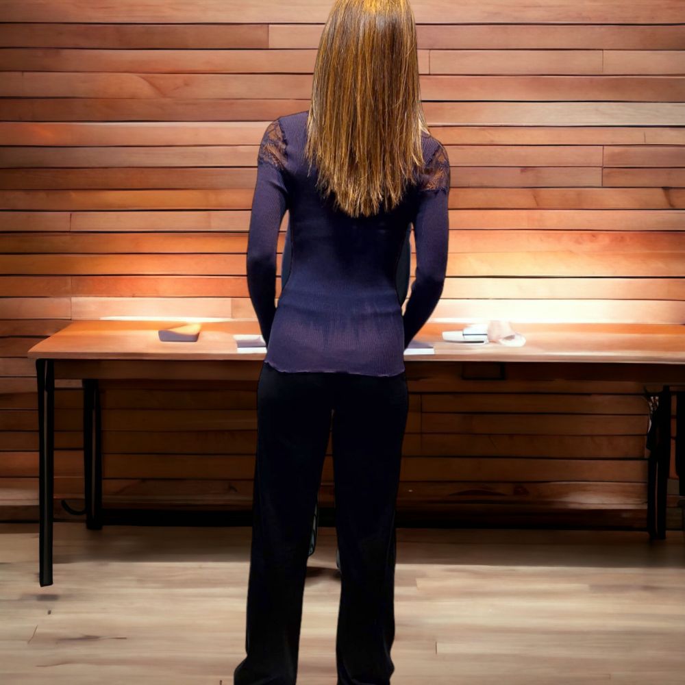 Long sleeves crafted in a delicate ribbed fabric blend of 70% extra fine merino wool and 30% premium pure silk, with romantic and elegant Chantilly details on the V-neckline. Seamless side construction for an ultra-soft feel on your skin and a more comfortable fit on your body.