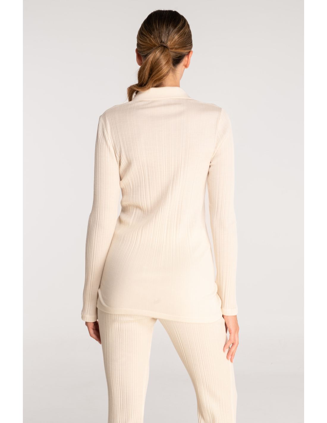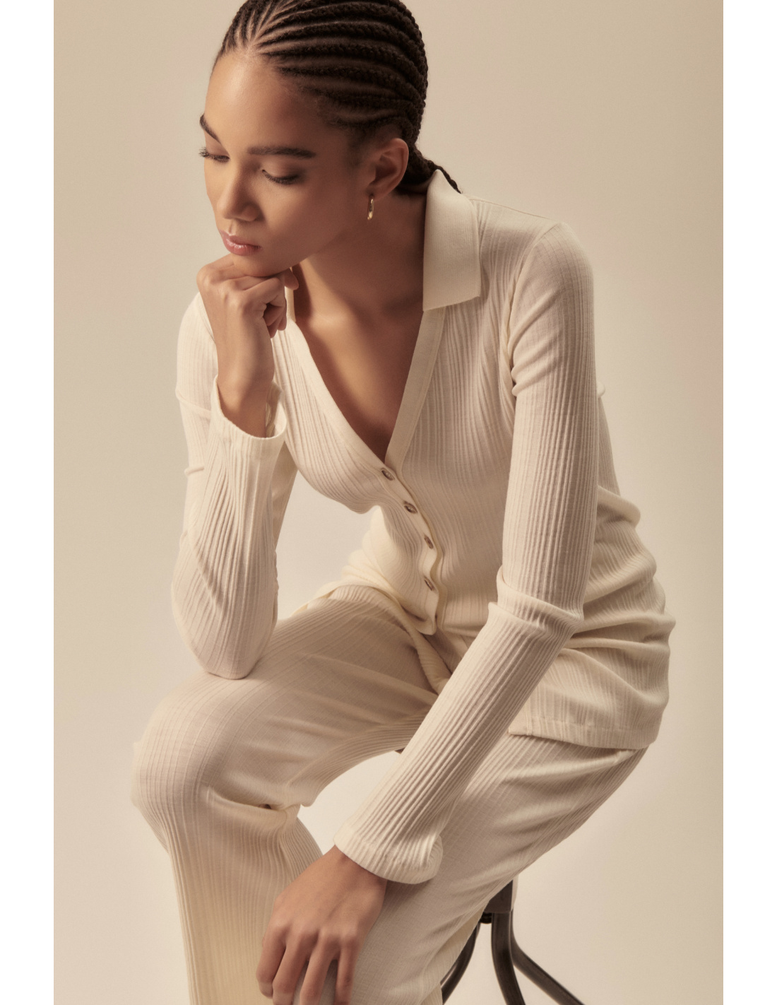 Long sleeve jacket in delicate ribbed fabric, blend of extra fine merino wool and premium pure silk, with a new and contemporary texture, given by the irregularity of the rib, and a front opening with buttons.