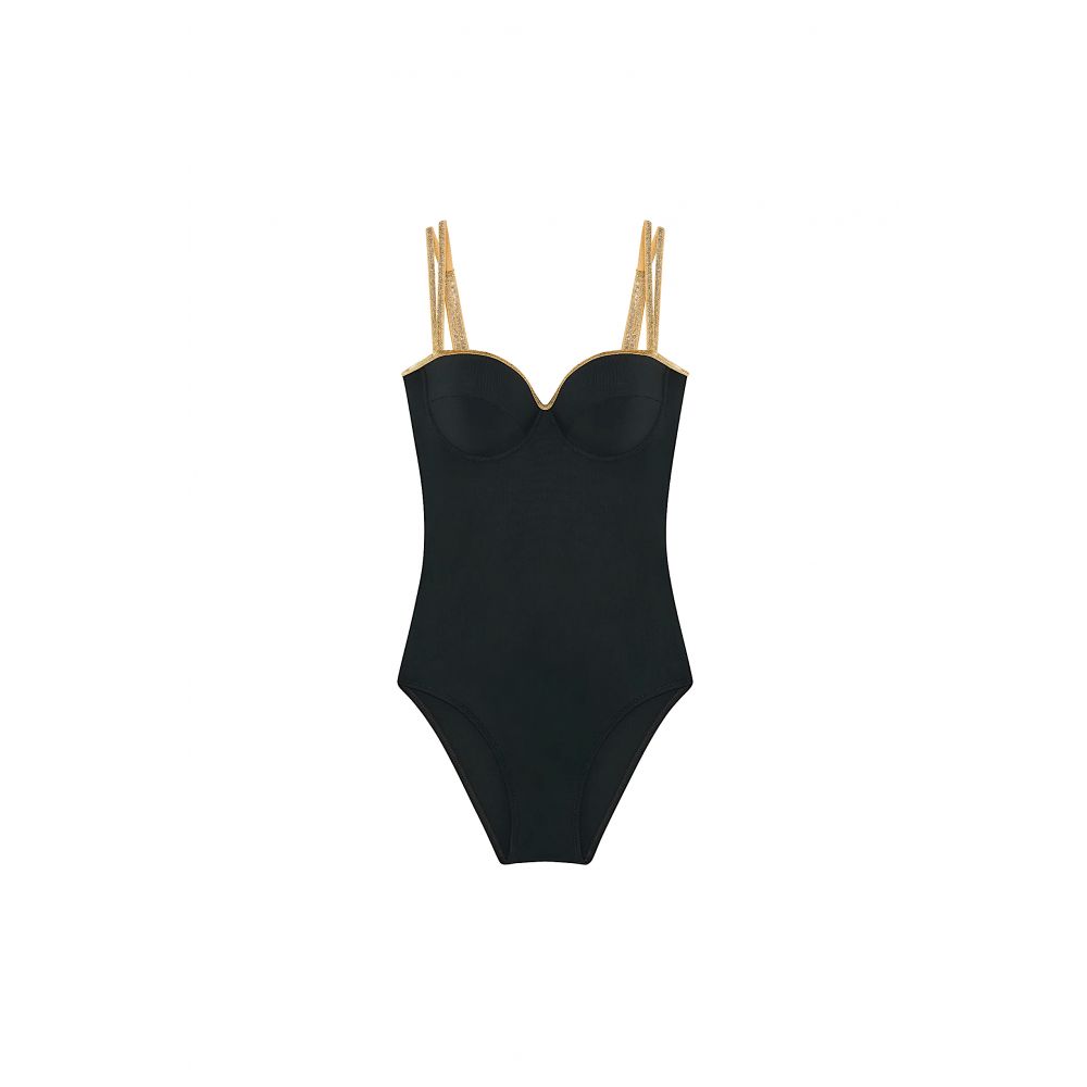 The TIMO one-piece swimsuit combines elegance and comfort with its cups and underwire. Its neckline trimmed with gold lurex elastic and its double adjustable and removable straps in gold lurex elastic ensure perfect support while adding a sophisticated touch. Black, a timeless color, is always elegant.