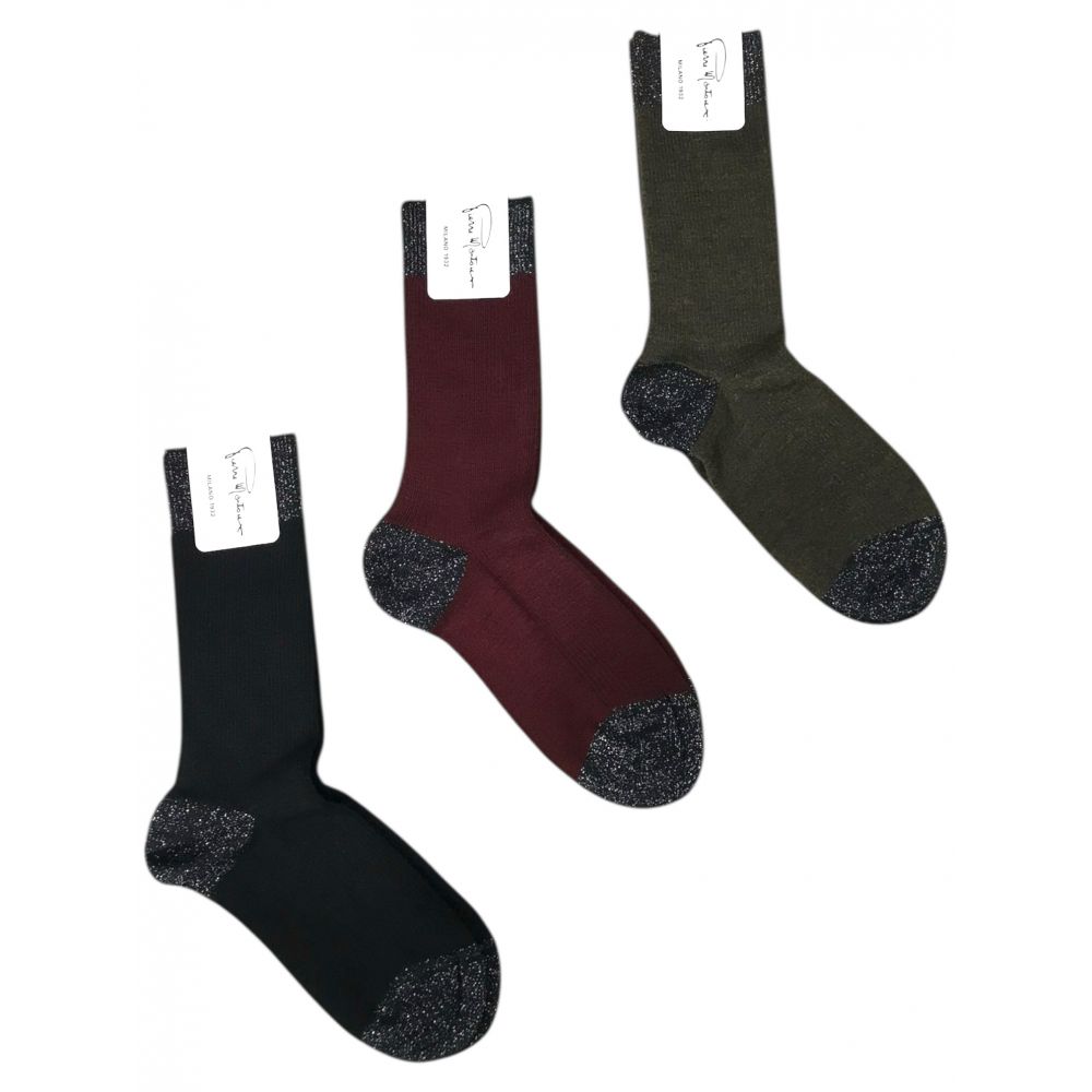The cuff, heel, and toe are in a contrasting color with a shimmering effect thanks to the lurex knit. The knit at the toe and heel ensures a soft and comfortable fit, while the cuff doesn't pinch or leave marks.