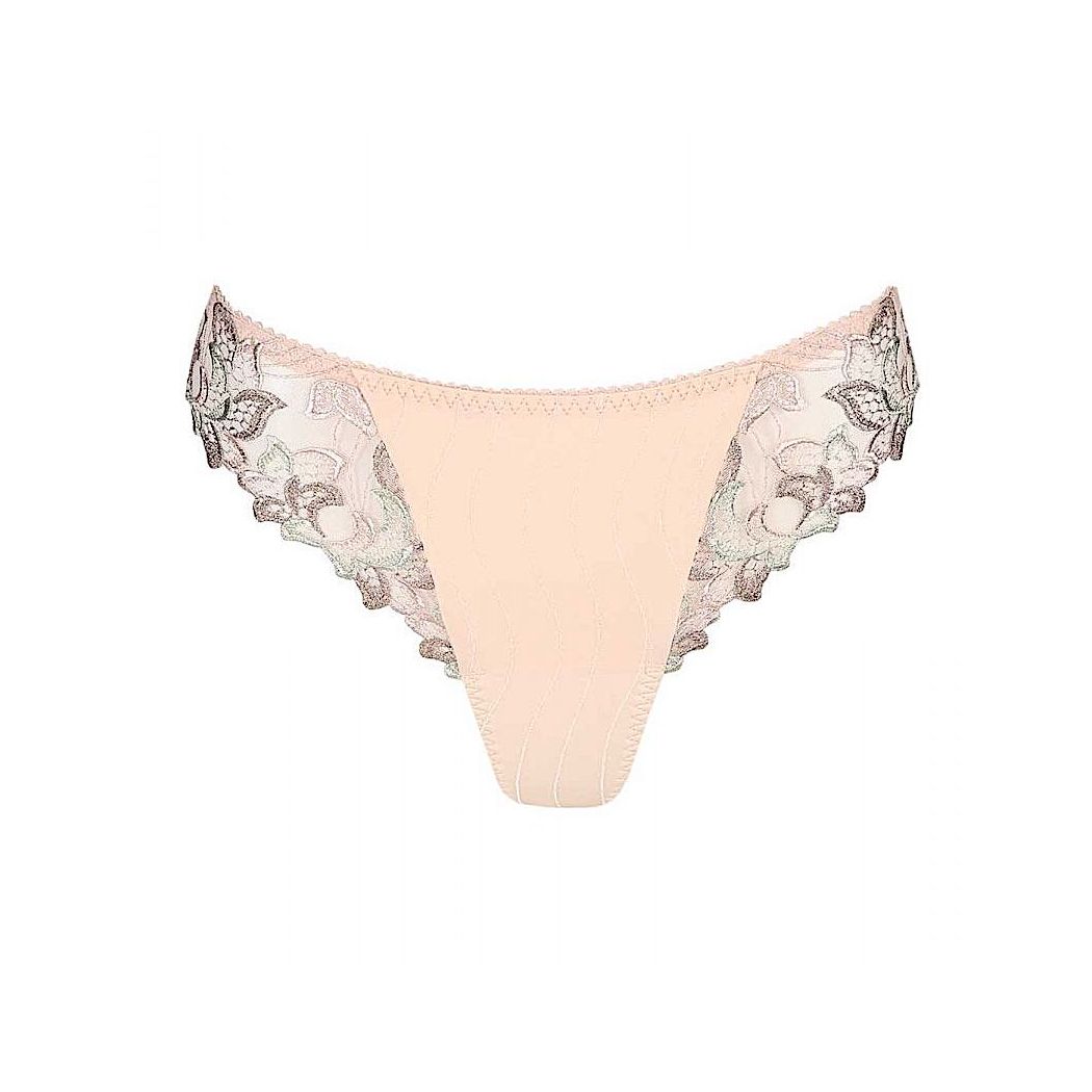 Luxurious opaque thong, adorned with elegant embroidery on the openings. Silky Tan, a chic and timeless slightly powdery color.