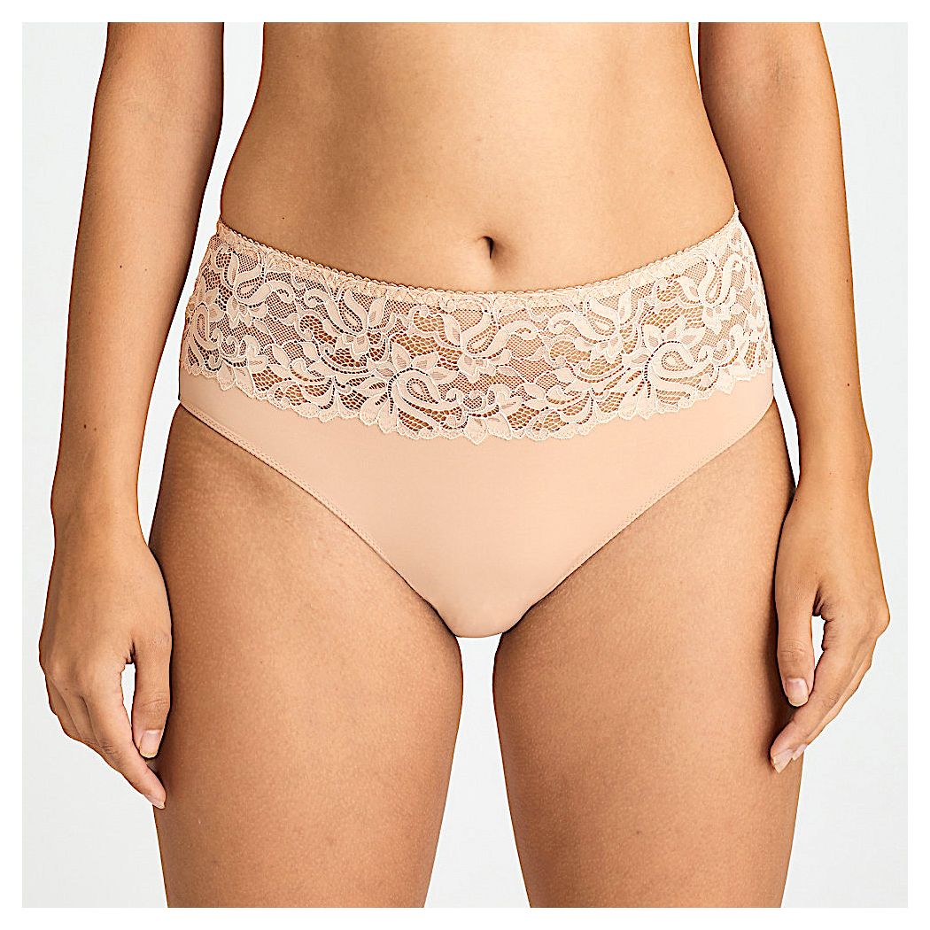 Pair these high-waist briefs with a lace bra for an ultra-feminine look. Made from a single-colored fabric with a lace waistband. The high waist has an ultra-comfortable fit With an elegant belted effect and a flattering cut for a feminine silhouette. Light Tan is a warm skintone hue that flatters all sun-kissed skin tones.