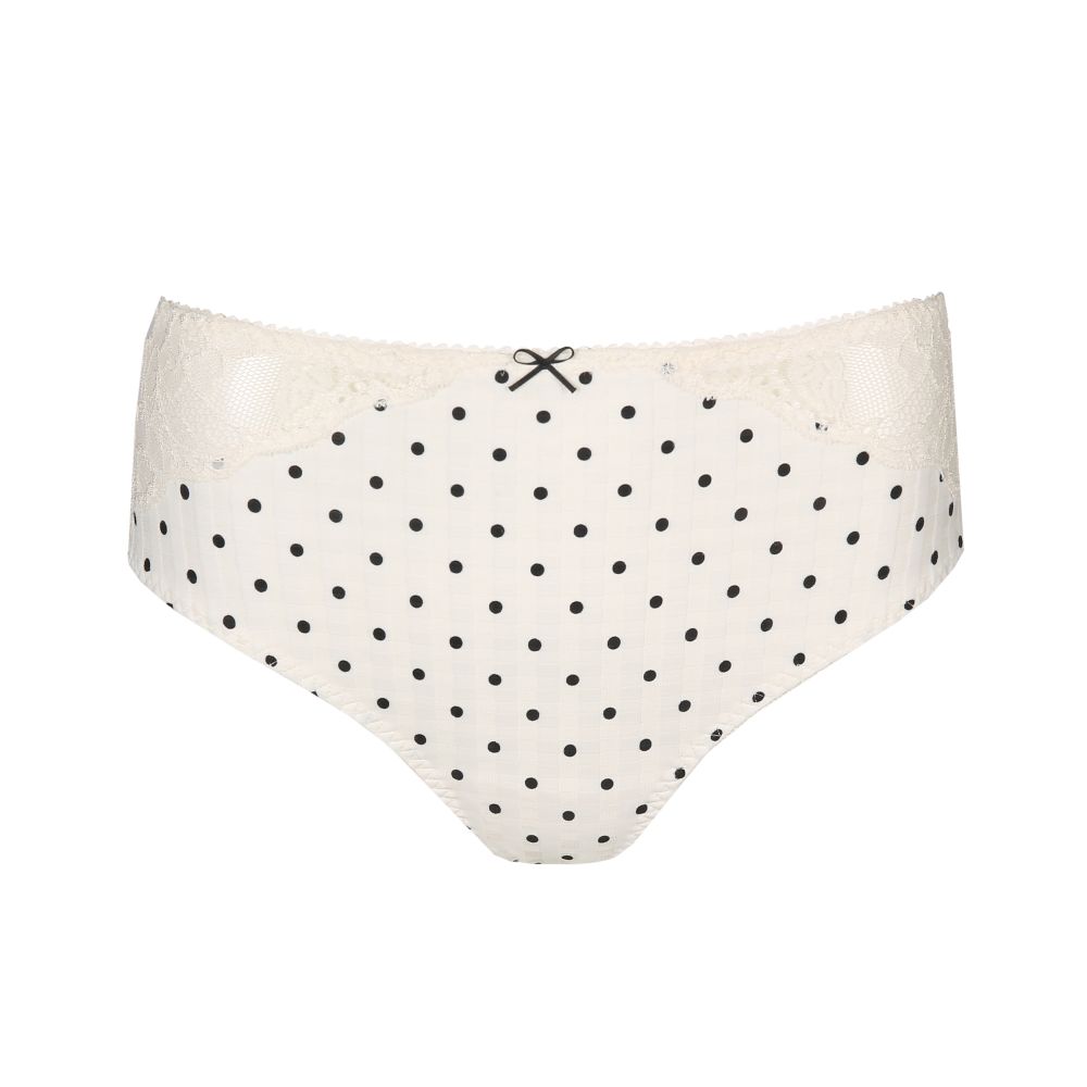 Elegant and comfortable high-waisted briefs in a checked fabric decorated with luxurious lace on the legs. Coco Classic is a cute black and white polka dot print with lace.