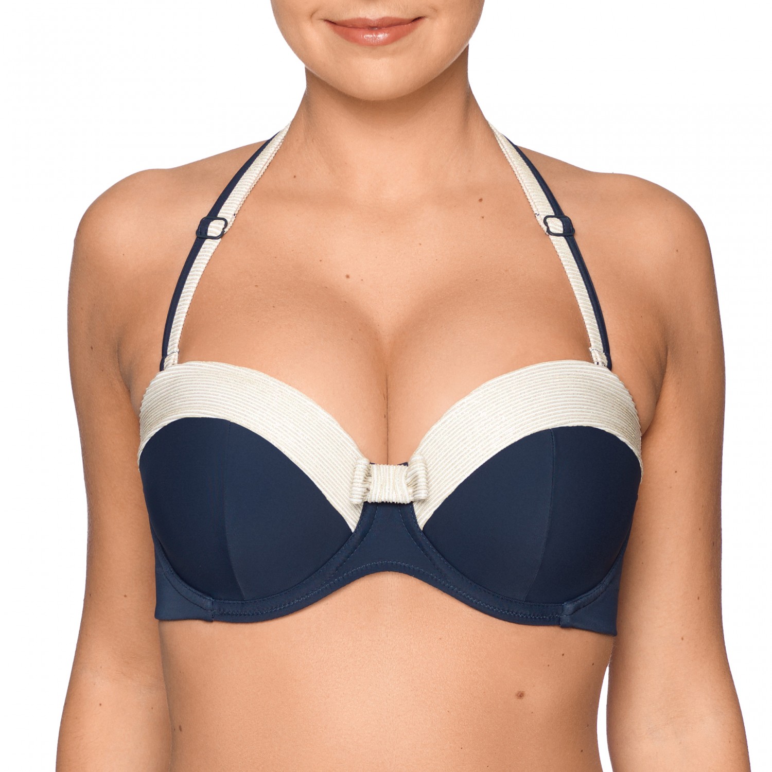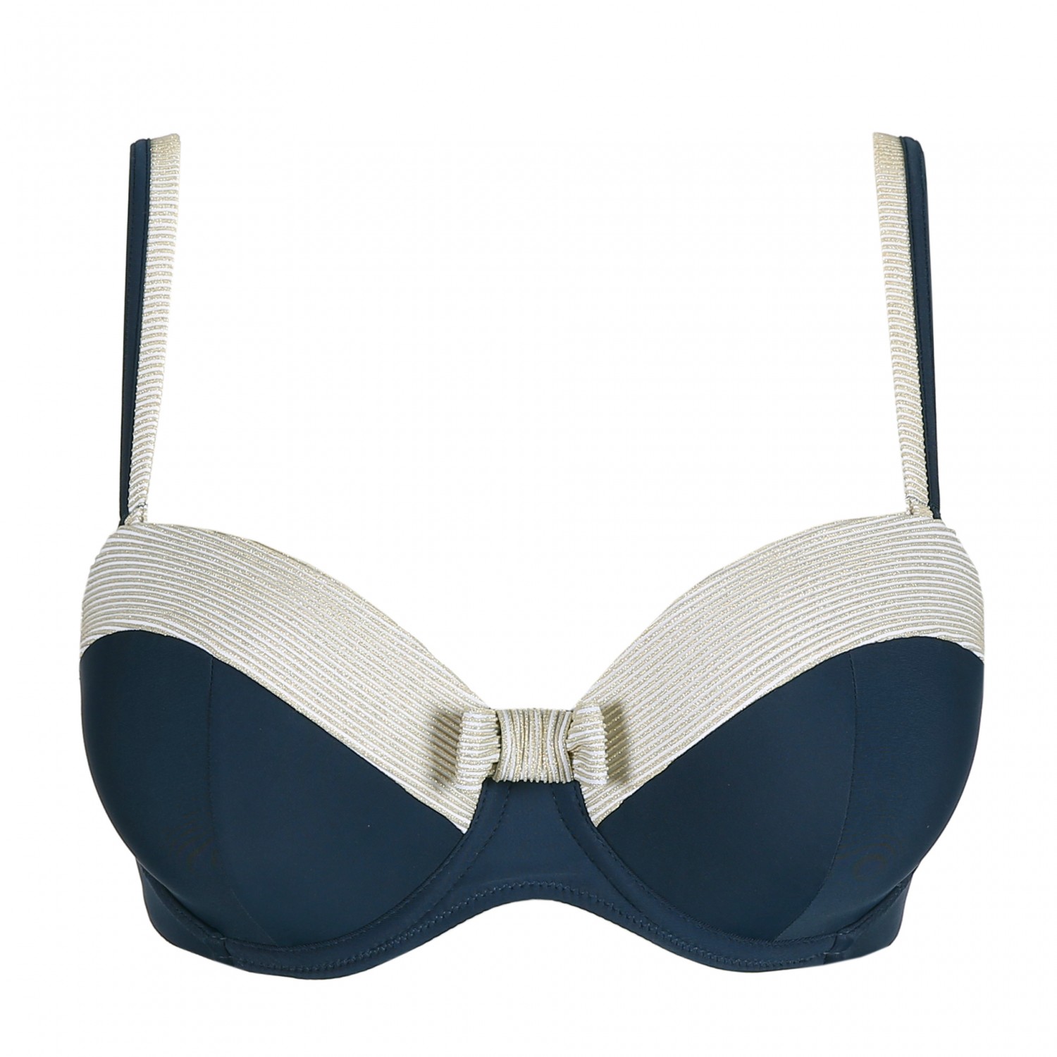 This bandeau bikini top is very sexy with or without shoulder straps. It has an underwire and padded cups, while the upper cups are finished with a clean line texture in golden thread. A big bow completes your sexy retro look. The straps can be worn over the shoulder or round the neck. The supple padded cups fit perfectly, uplift your breasts firmly and reveal a bit of your upper breasts. The stretch shoulder straps give your breasts extra uplift.