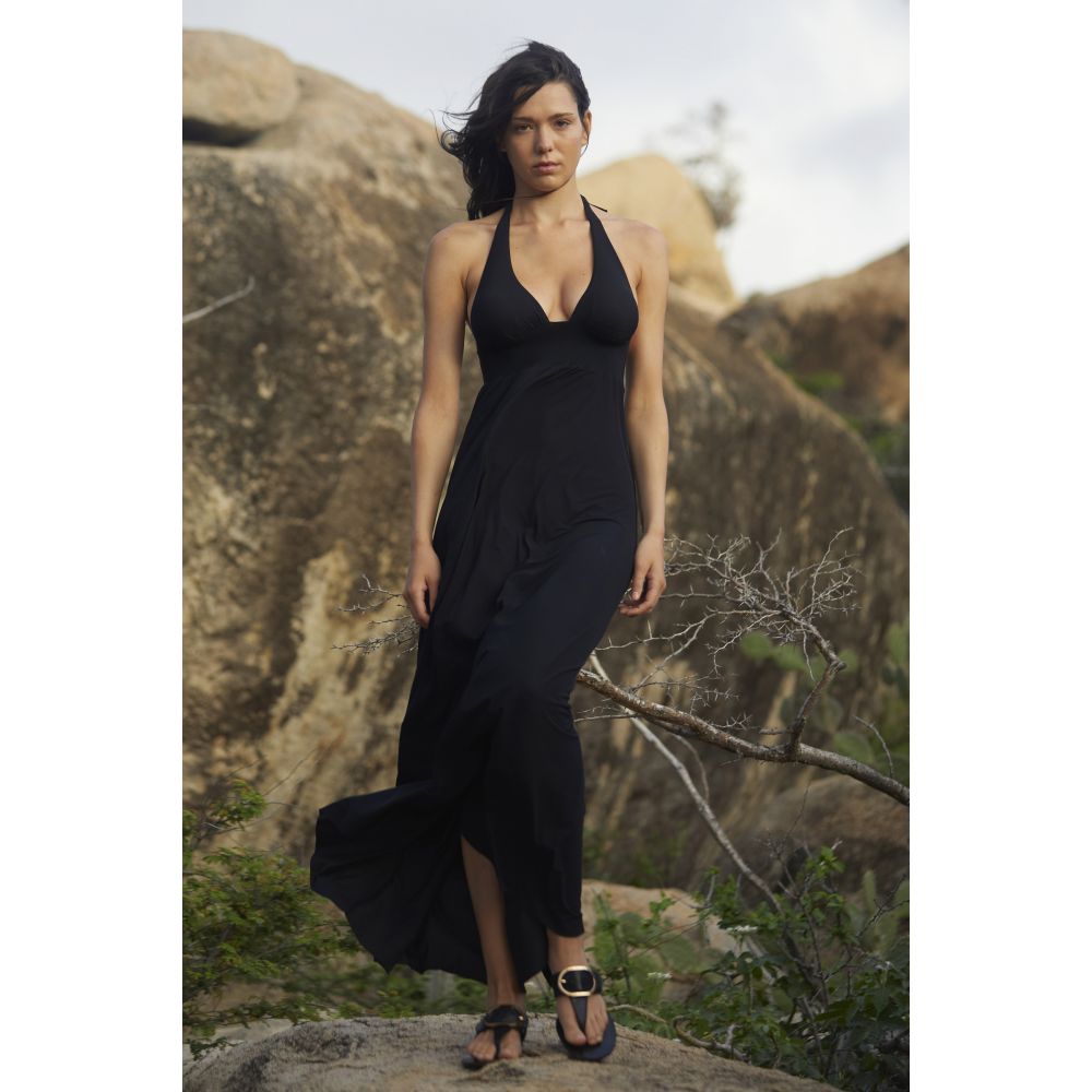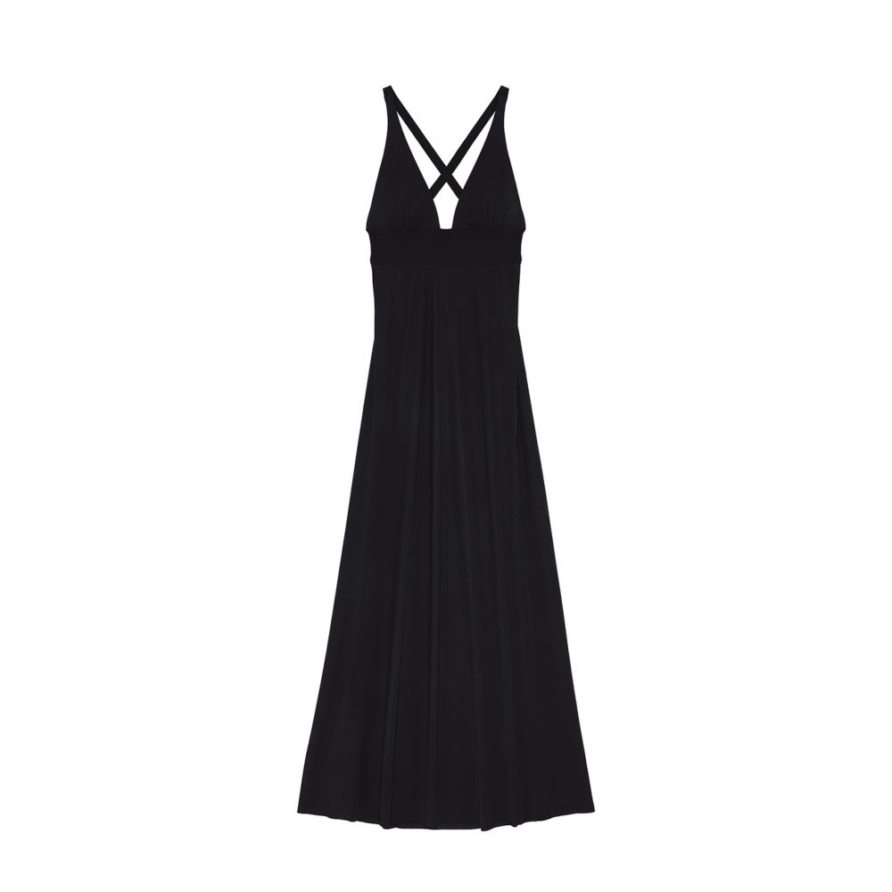 Revealing a bare back under delicate crossed straps, the long VICK dress plays with volumes with remarkable elegance. The bottom, fluid and flared, inspires comfort. On the bust, the fitted cut emphasizes the waist and offers a dizzying neckline. Timeless, black highlights all morphologies.