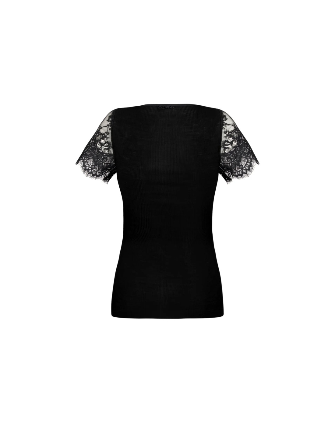 Short-sleeved T-shirt in tubular knit with lace insets on the front neckline and sleeves.